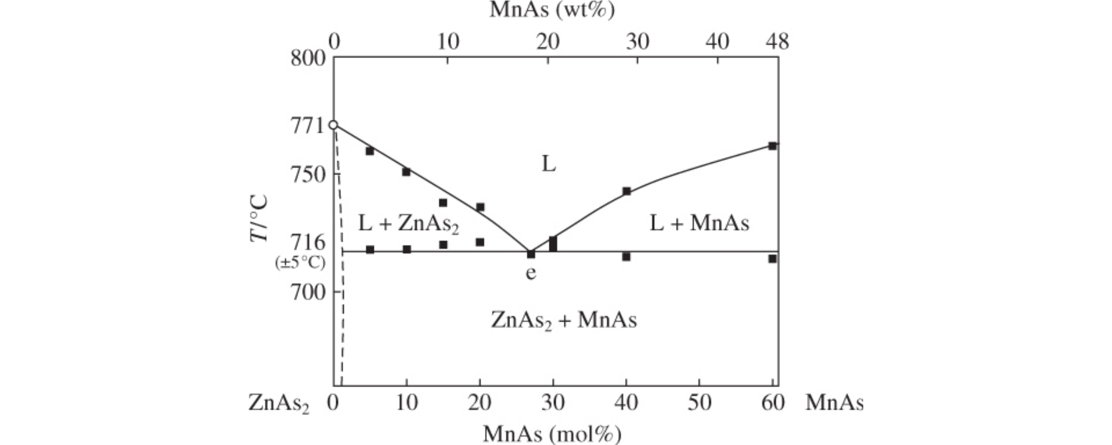 The ZnAs2–MnAs system, characterized by X-ray powder diffraction, differential thermal and microstructure studies, is of the eutectic type, with the coordinates of eutectic 73 mol% ZnAs2 and 27 mol% MnAs and Tm = 716 °C. The solubility of MnAs in ZnAs2 is lower 1 mol%. Alloys of ZnAs2 with MnAs are ferromagnetic with Tc ≈ 318 K, their magnetization being increased with raising the MnAs content.