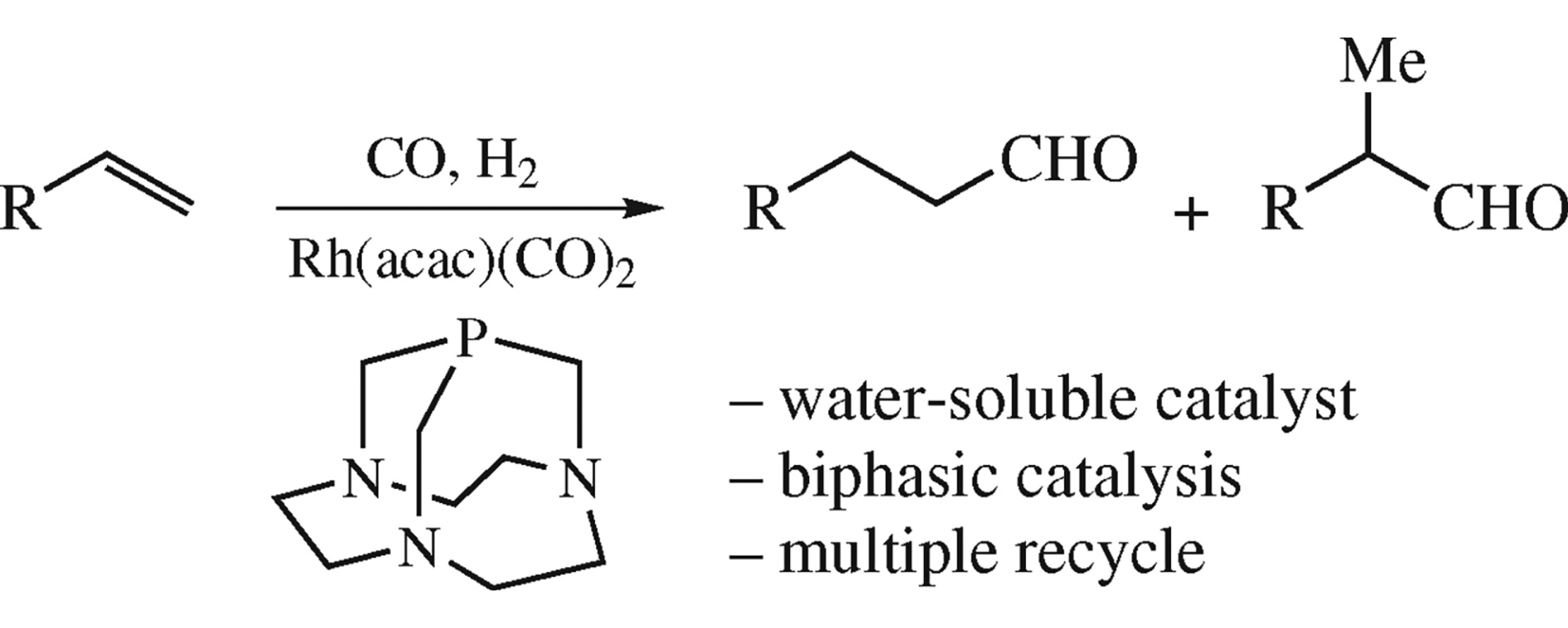 Rhodium-catalysed hydroformylation of styrene and aliphatic olefins under biphasic conditions in the presence of watersoluble 1,4,7-triaza-9-phosphatricyclo[5.3.2.14,9]tridecane (CAP) chemoselectively affords aldehydes. Multiple catalyst reuse without loss in performance is demonstrated.