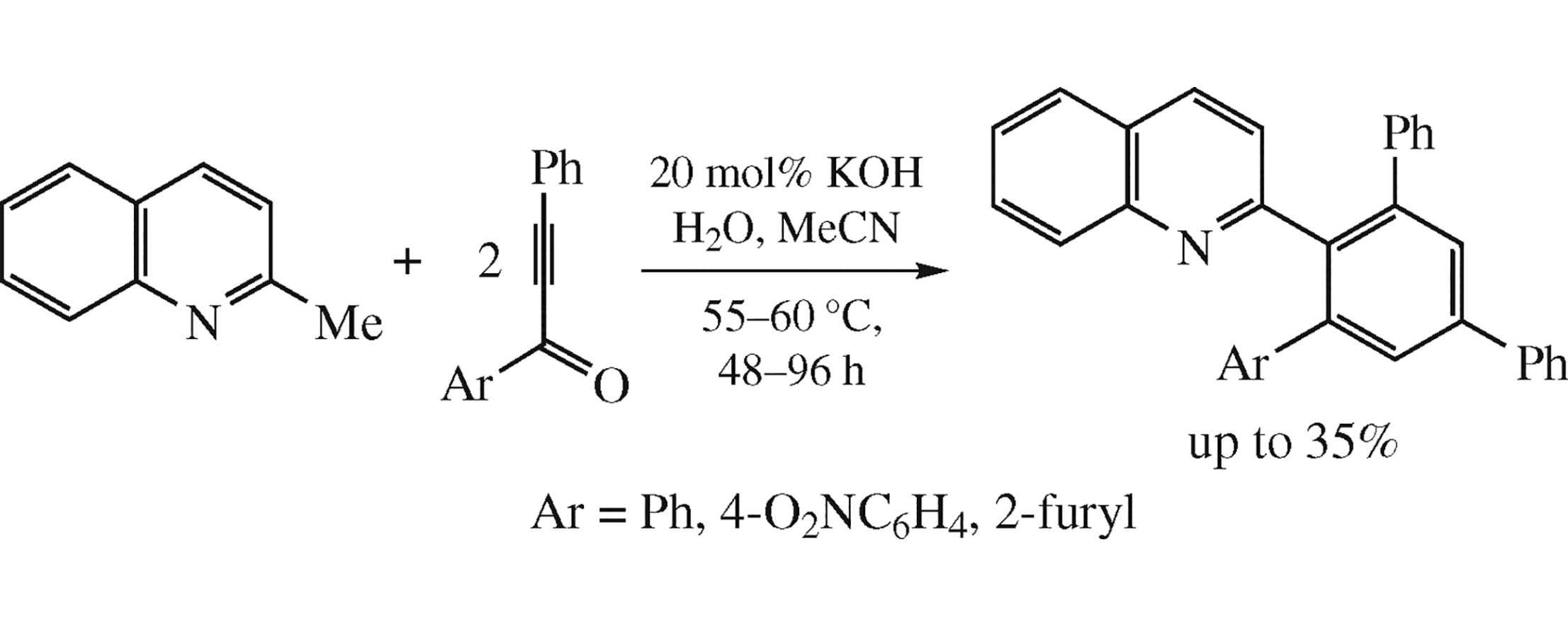 2-Methylquinoline reacts with 1-(het)aryl-3-phenylprop-2-yn-1-ones under mild transition metal-free conditions (55–60°C, 20 mol% KOH, H2O, MeCN) to afford 2-{5’-(het)aryl[1,1’ : 3’,1”]terphenyl-4’-yl}quinolines in up to 35% yield. The reaction likely proceeds via the intermediate 1,3-dipole followed by the double nucleophilic vinylation of the methyl group with two molecules of ynone and subsequent elimination of (het)arenecarboxylic acid.