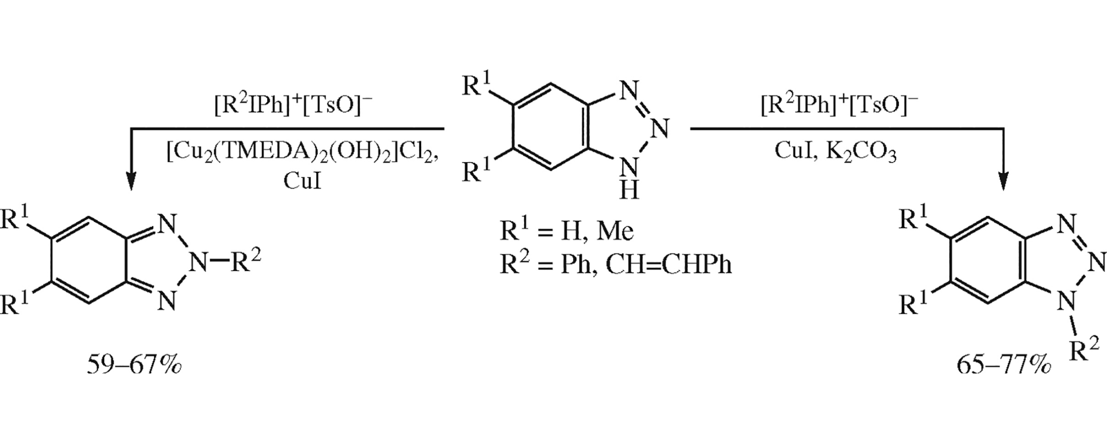 Modification of benzotriazoles with iodonium salts [diphenyl- and (E)-styrylphenyliodonium tosylates] occurs at the N1-position in the presence of K2CO3 as a base and CuI as a catalyst in CH2Cl2, whereas in the presence of stoichiometric amount of [Cu2(TMEDA)2(OH)2]Cl2 complex regioselective N2-modification proceeds. Two new CuI complexes based on benzotriazoles were synthesized and their crystal structures were determined by X-ray powder diffraction analysis.