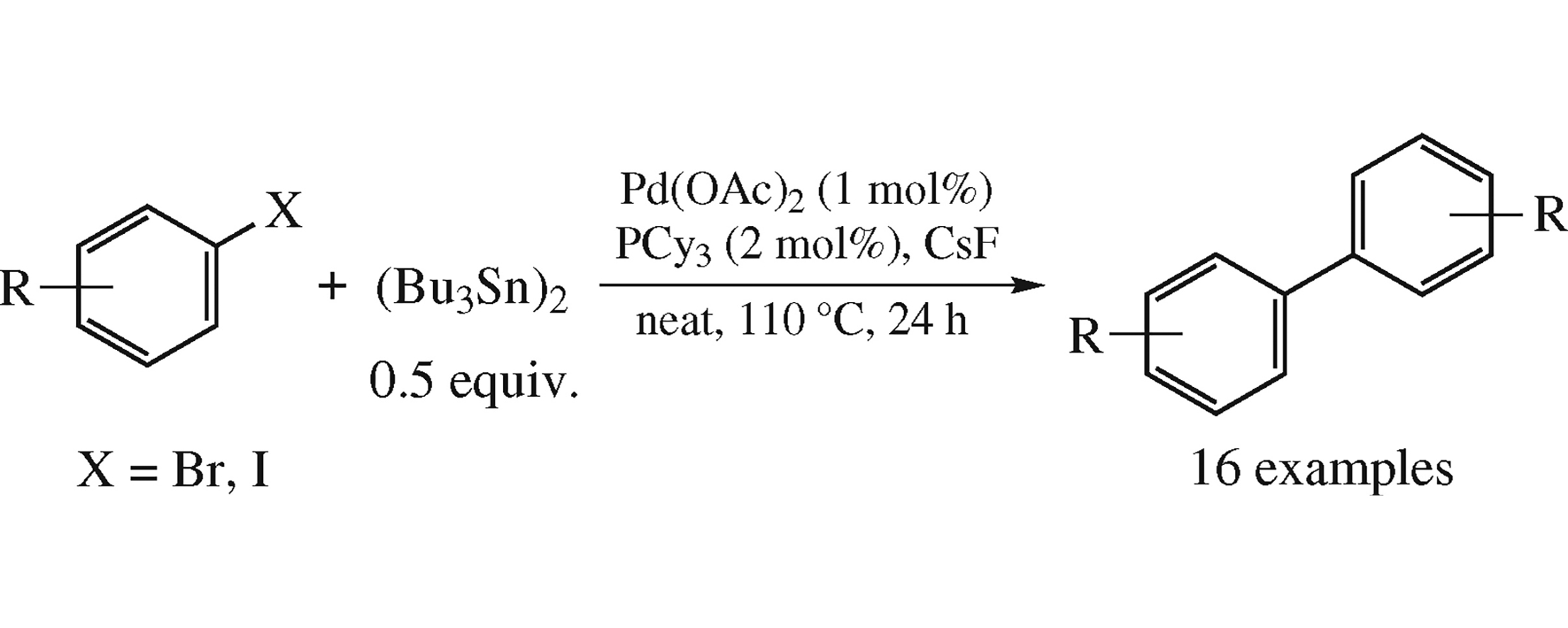 A new highly efficient solvent-free method for aryl bromide (iodide) homocoupling comprising the use of Pd(OAc)2/PCy3 system in the presence of CsF is suitable for substrates bearing functional groups not tolerant to lithium-, magnesium-, zincorganic reagents and strong bases.