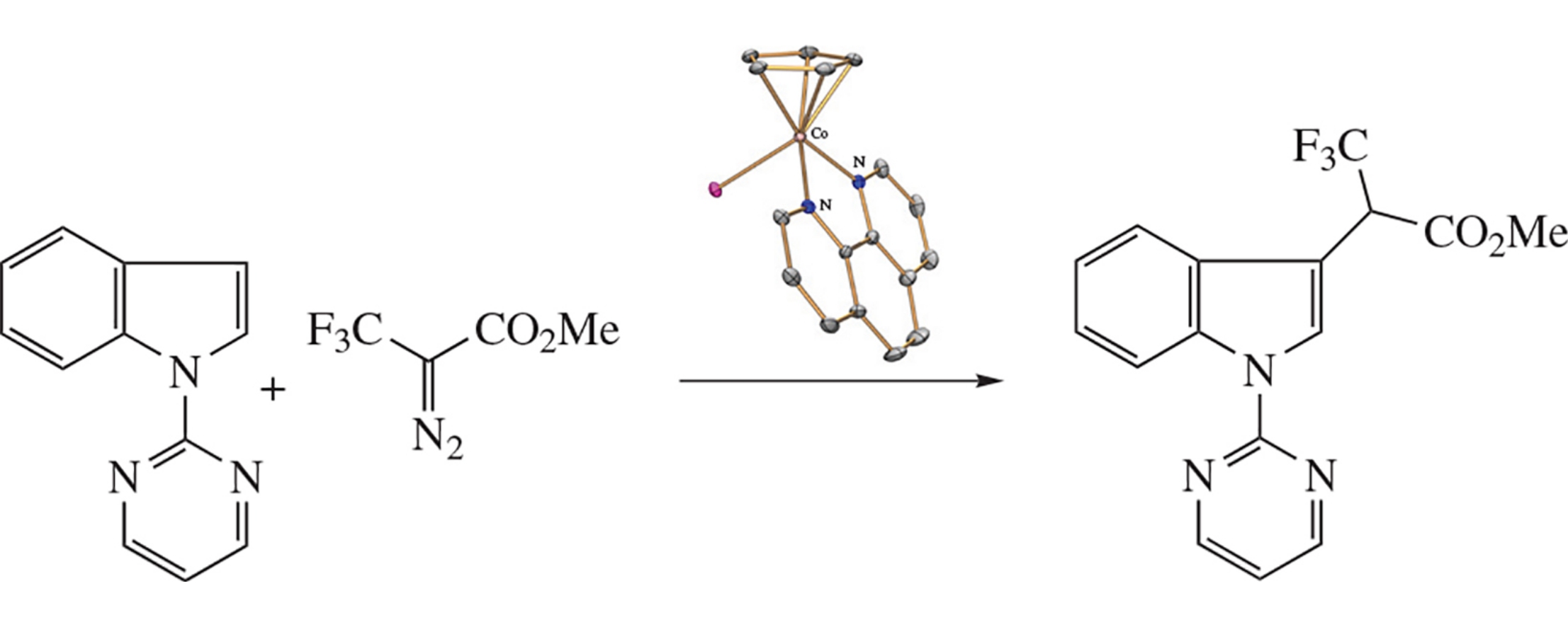 The carbonyl cobalt complex Cp*Co(CO)I2 catalyzes carbenoid Co alkylation of N-(pyrimidin-2-yl)indole with methyl 3,3,3-trifluoro-2-diazopropionate regioselectively giving 2-substituted indole, while the N,N’-ligated cations [CpCo(L)I]+ (L=bipy, phen) provide 3-substitution exclusively. The structure of [CpCo(phen)I]PF6 was investigated by X-ray diffraction.