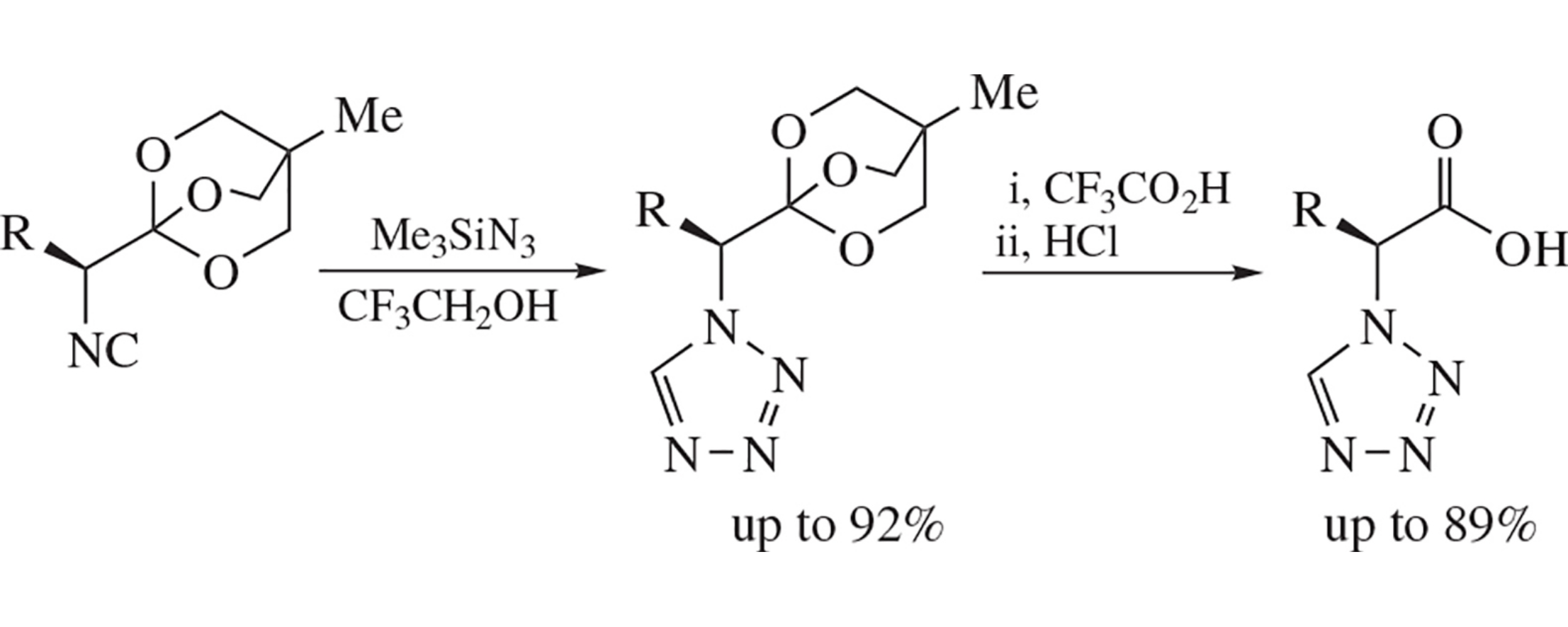 Optically active α-(tetrazol-1-yl)-substituted carboxylic acid OBO-esters were synthesized from the corresponding a-isocyano OBO-esters and trimethylsilyl azide in up to 92% yield. Subsequent acidic hydrolysis proceeds without epimerization and makes it possible to prepare enantiomerically pure α-(tetrazol-1-yl)-substituted carboxylic acids in up to 89% yield.