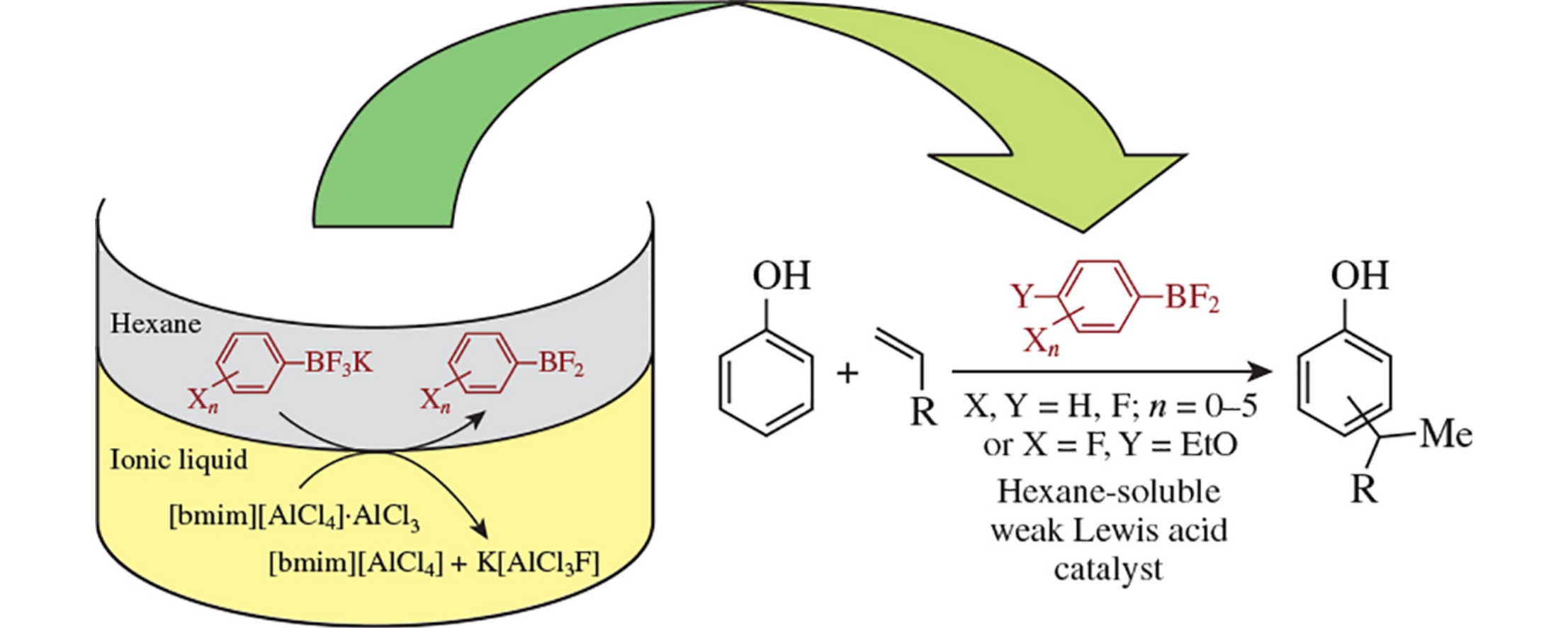 A new approach for preparation of aromatic and fluoroaromatic difluoroboranes via the interaction between corresponding aryltrifluoroborates and ionic liquids containing tetrachloroaluminate-anion and aluminum chloride has been developed. Catalytic properties of obtained aryldifluoroboranes have been investigated in model reactions of phenols alkylation. The dependence of catalytic properties on both the nature of solvent used and the type of substituents in the aromatic ring of difluoroborane has been established.