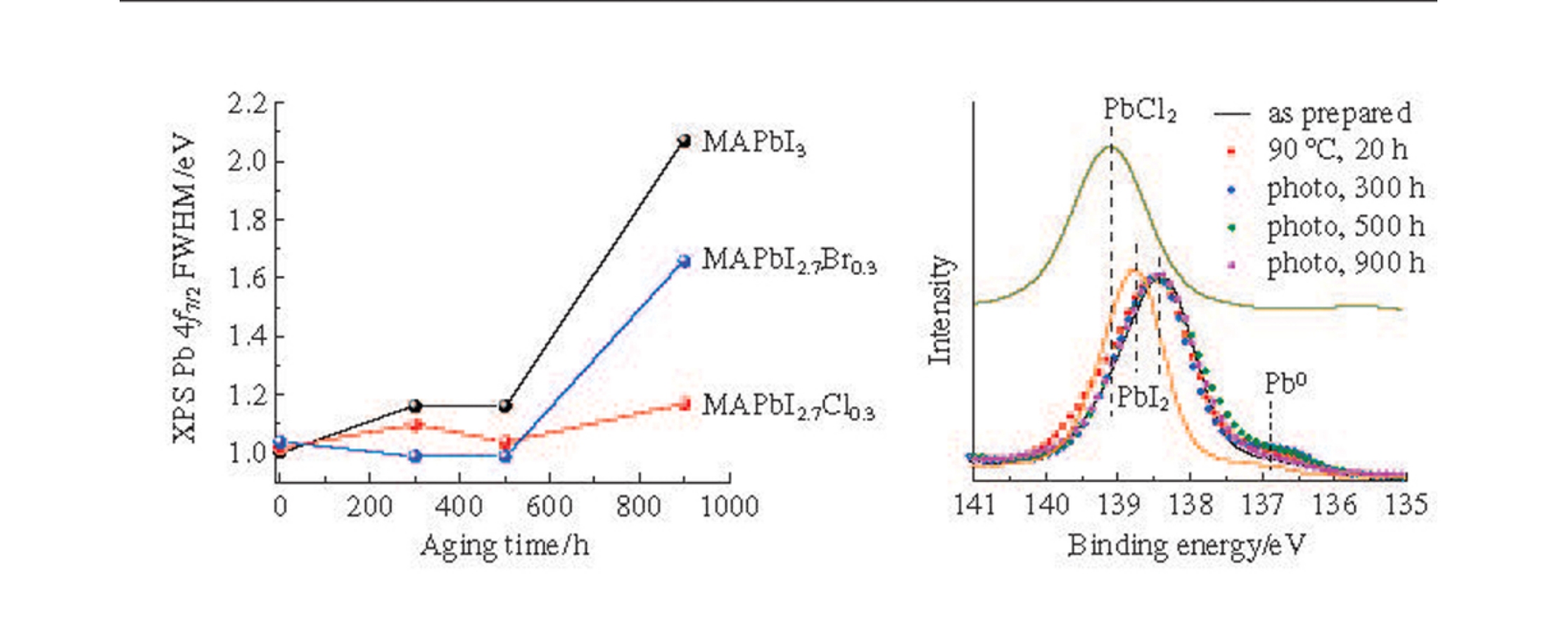The effect of I–/Cl–and I–/Br–mixing on the thermal and photochemical degradation of organometallic perovskite MeNH3PbI3 (MAPbI3) was studied by X-ray photoelectron spectroscopy, which revealed the opportunity to essentially increase the photo and thermal stabilities of the material depending on the level and position of halide-mixing. The largest positive effect was observed for the small concentration of chloride substituent (MAPbI2.7Cl0.3), while the full halide substitution (MAPbBr3) had a negative effect on the stability of hybrid perovskite.