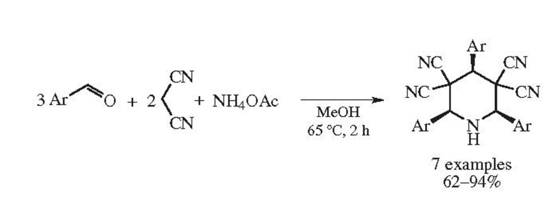 The Knövenagel–Michael–Mannich cascade reaction of aromatic aldehyde (3 equiv.), malononitrile (2 equiv.) and ammonium acetate or aqueous ammonia provides convenient stereoselective access to cis,cis-2,4,6-triaryl-3,3,5,5-tetracyanopiperidines in 62–94% yields. Six new bonds form as a result of the domino process, ammonium acetate serving as a nitrogen source.