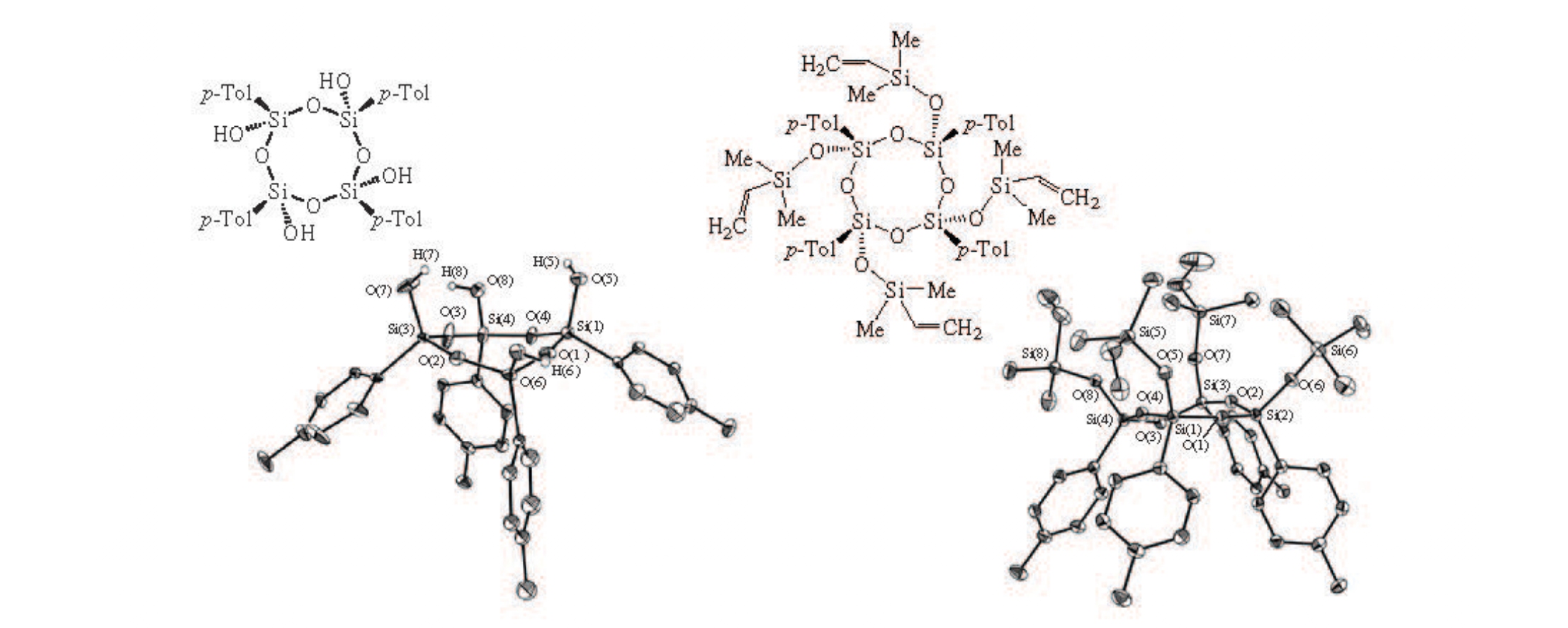 New all-cis-tetra(p-tolyl)cyclotetrasiloxanetetraol and its derivatives with Si(CH=CH2)Me and Si(H)Me2 groups have been prepared and characterized by IR and NMR spectroscopy, GPC, mass spectrometry, TGA and DSC. Molecular and crystalline structures of the tetraol and its derivative with four Si(CH=CH2)Me groups have been determined by single-crystal X-ray diffraction.