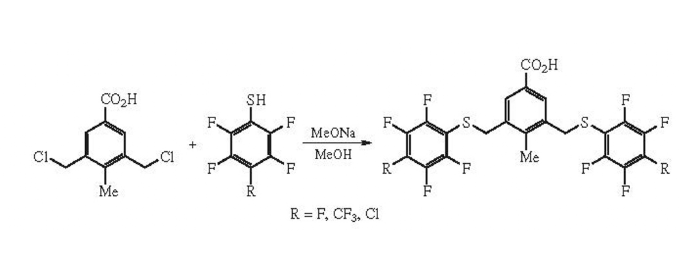 Chloromethylation of p-toluic acid affords 3,5-bis(chloro- methyl)-4-methylbenzoic acid whose subsequent treatment with arenethiols brings about spacer dendrimeric blocks containing polyfluoroarylsulfanyl fragments in a total yield of 60-75%.