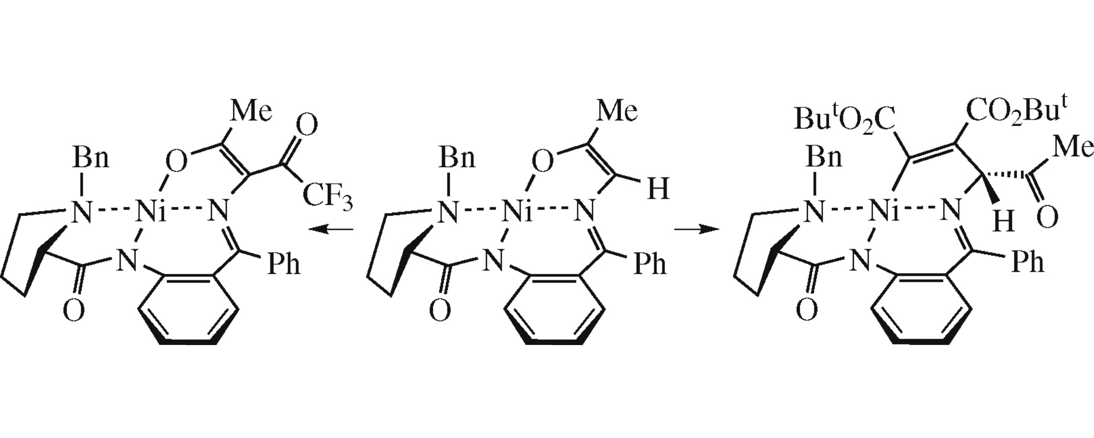 A representative within a new class of chiral enol NiII complexes derived from a Schiff base of aminoacetone and (S)-2-N-(N-benzylprolinoylamino)benzophenone was prepared, and its performance in nucleophilic addition was estimated. The complex was inert towards aldehydes and activated C=C bonds but reacted with carboxylic anhydrides and di-tert-butyl acetylenedicarboxylate. An unusual Michael addition intermediate stabilized by the Ni–C bond was discovered in the latter reaction.