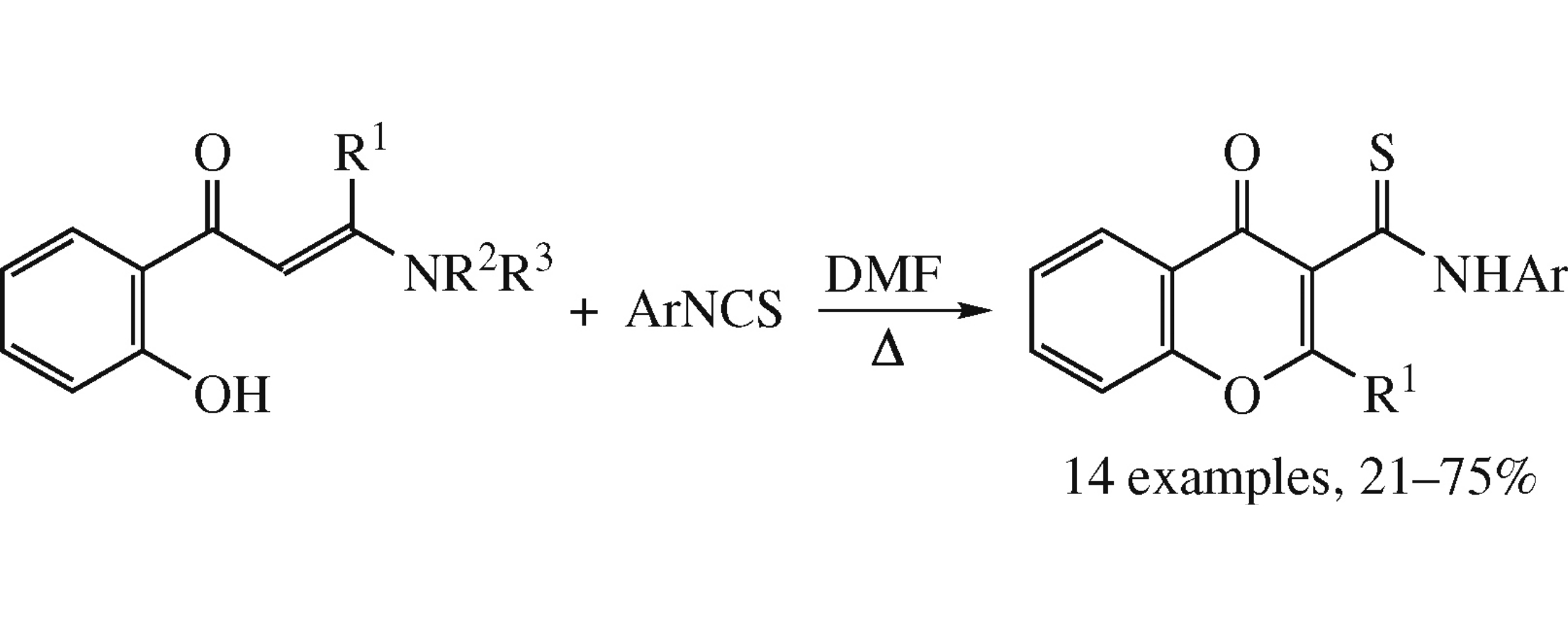 New both 2-unsubstituted and 2-substituted 3-(N-arylthiocarbamoyl)chromones were obtained by the reaction between 3-dimethylamino-1-(2-hydroxyaryl)prop-2-en-1-ones and aryl isothiocyanates.