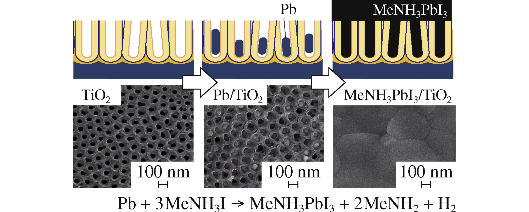A new processing technique is proposed for composites based on the hybrid organic–inorganic perovskite MeNH3PbI3 and anodic titania nanotube arrays, which includes a direct gasphase conversion of metal lead nanorods electrodeposited inside the pores of anodic titanium dioxide. This technique may be useful for a design of solar cells and optoelectronics applications
