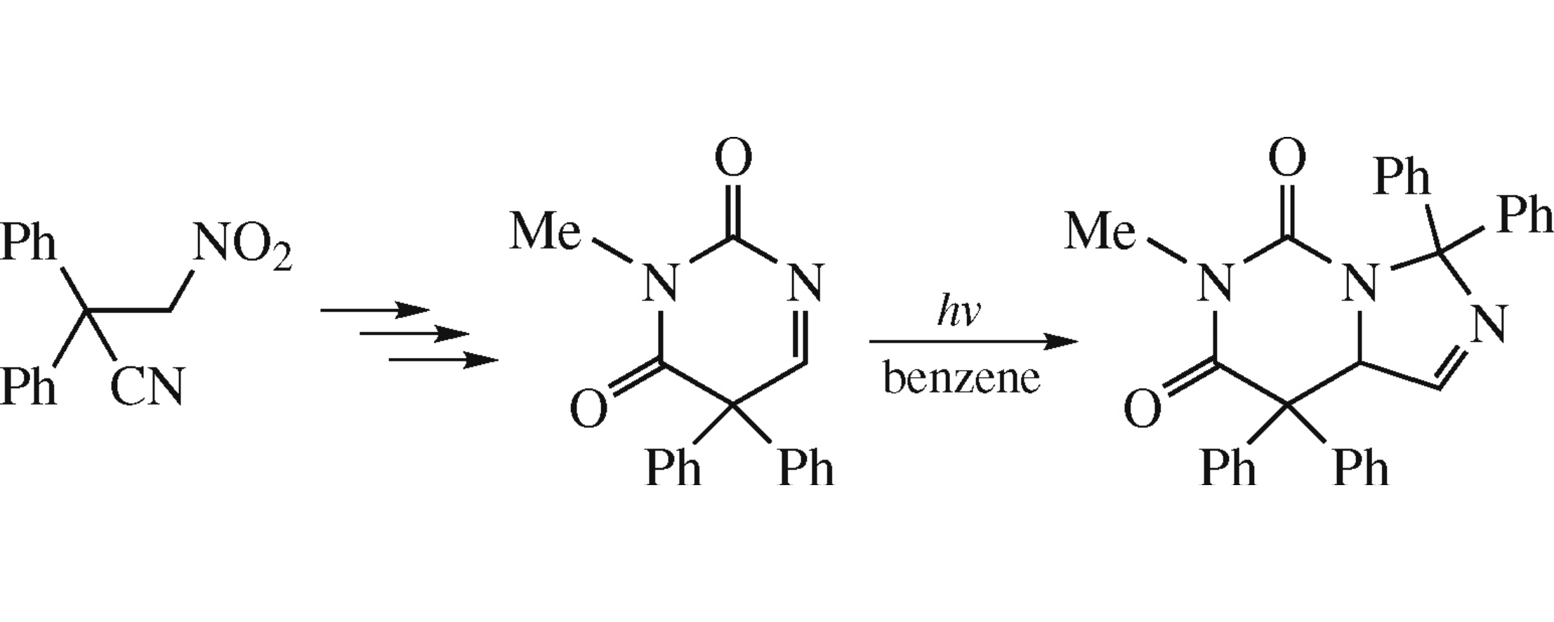The herein obtained 3-methyl-5,5-diphenylpyrimidine-2,4-(3H,5H)-dione forms upon photolysis an unusual bicyclic product, namely, 6-methyl-3,3,8,8-tetraphenyl-8,8a-dihydroimidazo[1.5-c]pyrimidine-5,7(3H,6H)-dione in 21% yield. The transformation starts with elimination of carbon monoxide and methyl isocyanate from the molecule of substrate via a ‘Type A’ photochemical process giving 3,3-diphenylazirine. Then 1,3-dipole species generated from the latter is trapped by the starting compound via a [3+2] cycloaddition.