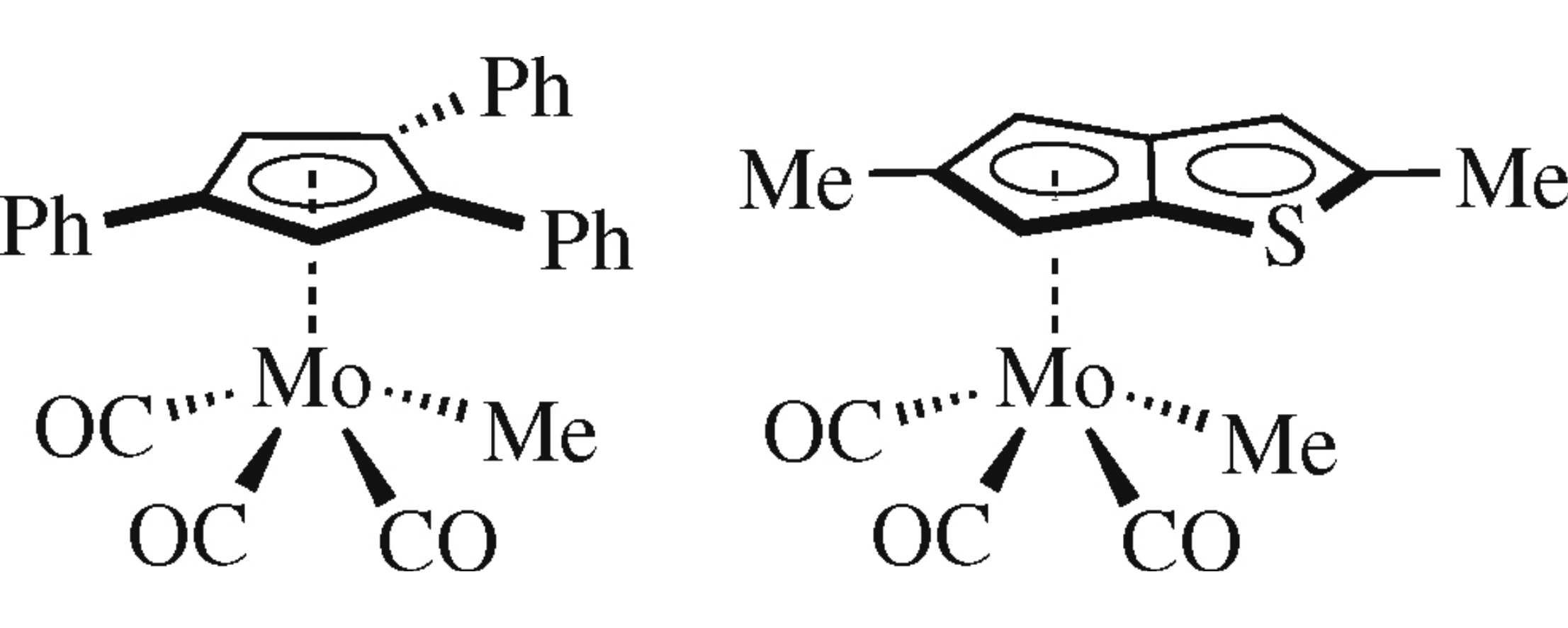 Half-sandwich carbonyl molybdenum complexes with bulky triphenylcyclopentadienyl and cyclopenta[b]thienyl ligands have been synthesized, analyzed by X-ray diffraction method and tested as precatalysts in α-olefin epoxidation with tert-butyl hydroperoxide.