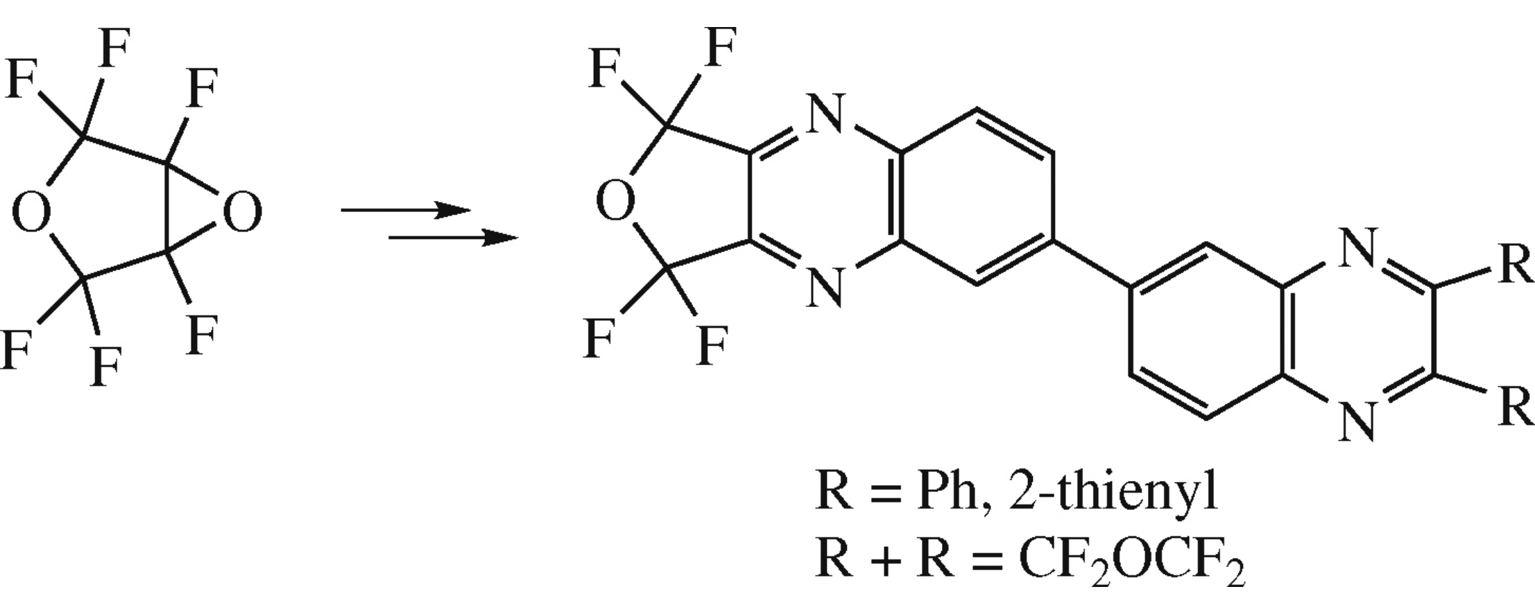 The reaction between equimolar amounts of 3,4-epoxyperfluorooxolane and 3,3′,4,4′-tetraaminobiphenyl provided a new fluorine-containing diamino derivative of furoquinoxaline, namely, 6-(3,4-diaminophenyl)-1,1,3,3-tetrafluoro-1,3-dihydro-furo[3,4-b]quinoxaline. Its reactions with 3,4-epoxyperfluorooxolane, 1,2-diphenylethanedione, or di(2-thienyl)ethanedione yielded new quinoxaline fluorine-containing polycyclic compounds whose structures were confirmed by X-ray diffraction.