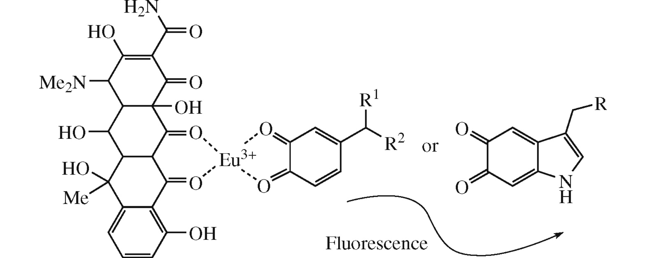 New ternary complexes of europium with oxytetracycline possessing the intense fluorescence have been obtained for prospective applications in the high-sensitive detection of biogenic amines and their metabolites in biological fluids. Their stability constants have been determined using the Foster–Hammick–Wardley method based on the fluorescent spectroscopy data. The dependence between structure differences, stability constants of ternary complexes of europium–oxytetracycline with biogenic amines, and their metabolites, and sensitivity of their determination has been established.