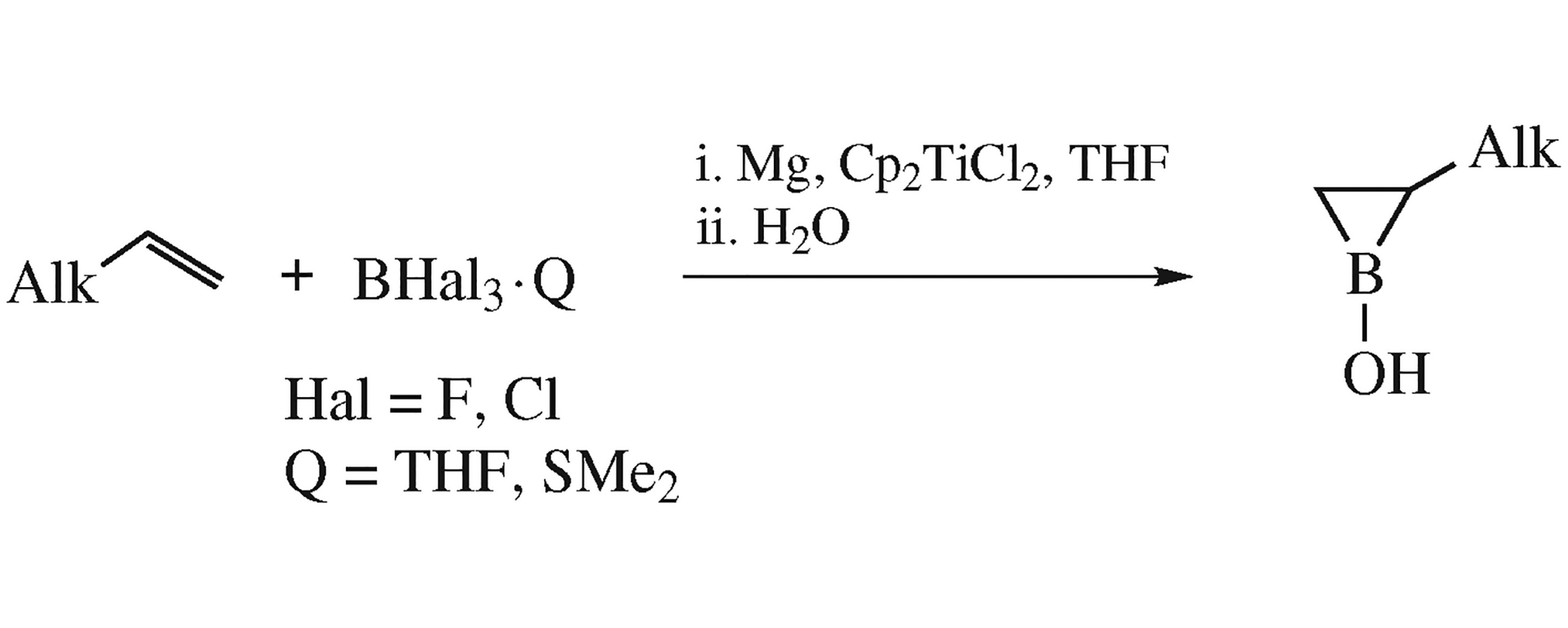 2-Alkylboriran-1-ols were obtained in a one-pot process by hydrolysis of 1-fluoro- and 1-chloroboriranes in 90–92% yield. The starting 1-haloboriranes were generated by cycloboration of α-olefins with BCl3·SMe2 or BF3·THF in the presence of Mg metal (acceptor of halogen ions) and Cp2TiCl2 catalyst.