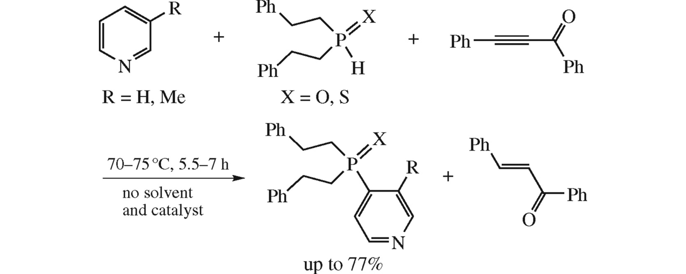 Solvent- and catalyst-free synthesis of 4-chalcogenophosphorylpyridines by oxidative regioselective cross-coupling of pyridines with secondary phosphine chalcogenides using 1,3-diphenylprop-2-yn-1-one as a trigger and oxidant under mild conditions 70-75 °C, 5.5-7~h is reported.
