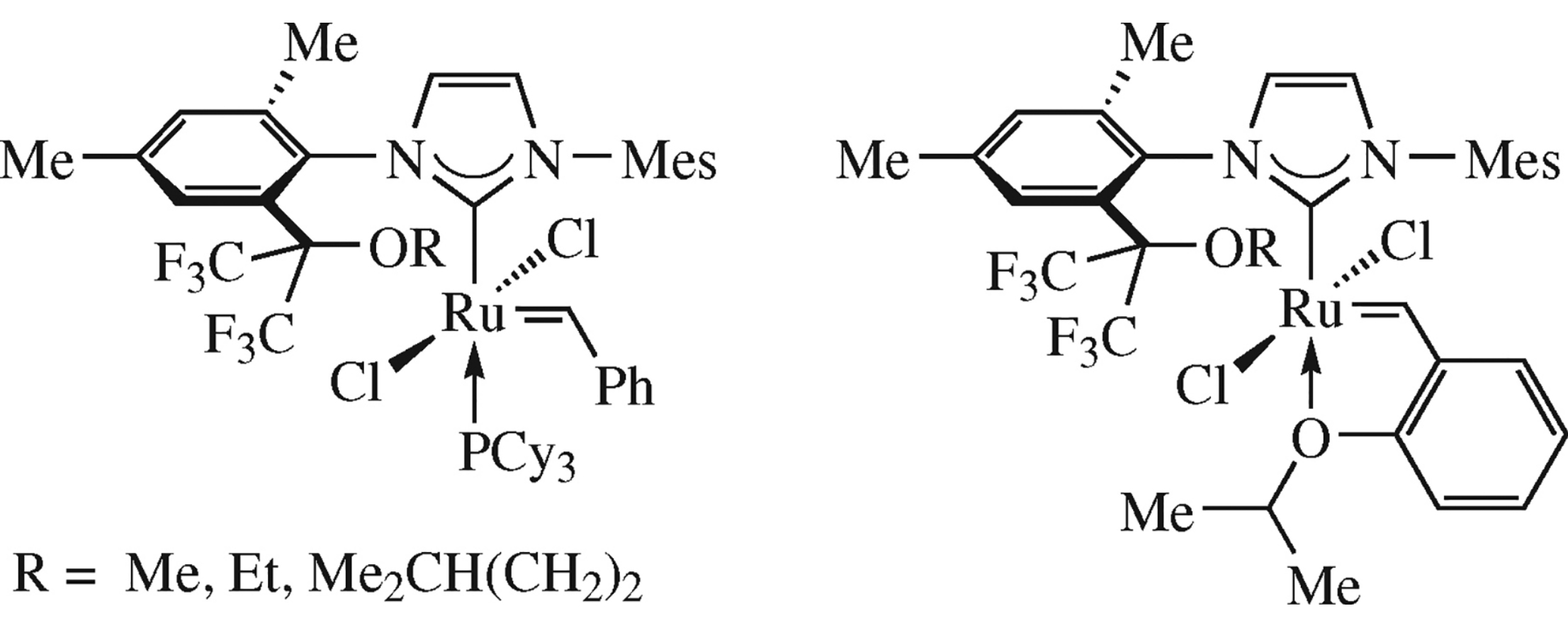 New olefin metathesis catalysts, unsaturated analogues of the Grubbs II and Hoveyda–Grubbs II ones, bearing bulky (alkoxy)hexafluoroisopropyl groups in one of the aryl substituent of NHC ligand provide high conversions in model ring closing metathesis of diallyl- and allylmethallylmalonates.