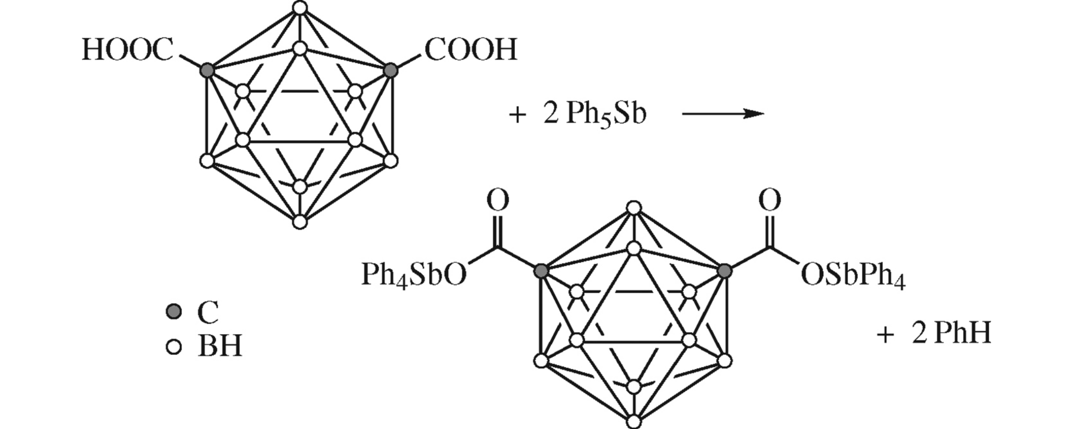 The reaction between pentaphenylantimony and meta-carboranedicarboxylic acid in benzene leads to the title compound that was characterized by X-ray diffraction data.