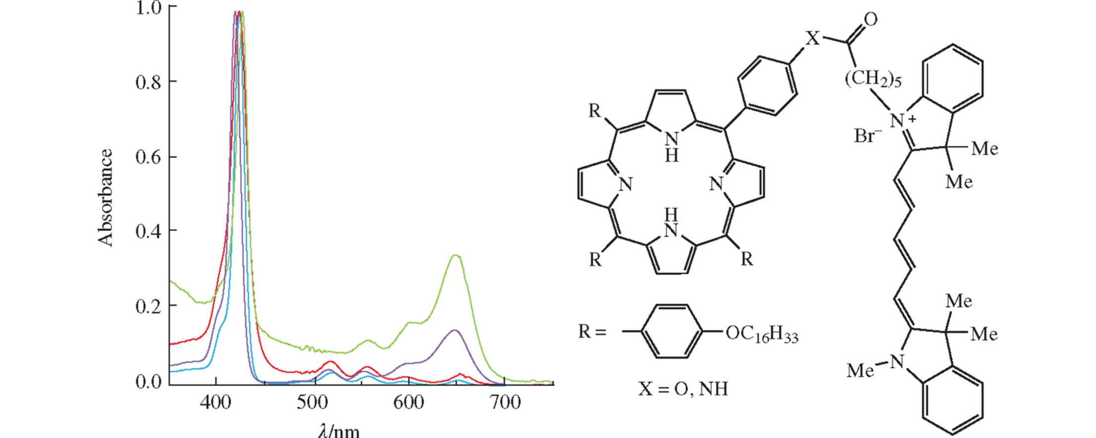 New amphiphilic conjugates of porphyrins and cyanine dye Cy5COOH were prepared by the creation of ester or amide bond between Cy5-carboxylic acid and hydroxy- or amino-substituted porphyrins. Study of self-aggregation of these conjugates in aqueous-organic media by dynamic light scattering and UV-VIS spectroscopy showed that the conjugates form micelles in THF–H2O with different ratios.