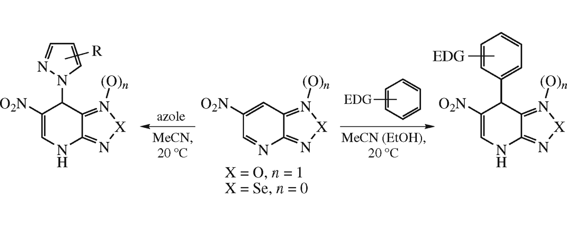 Highly electrophilic 6-nitro-4-azabenzofuroxan and 6-nitro-4-azabenzo[1,2,5]selenadiazole add π-excessive (het)arenes and other neutral nucleophiles at 7-position to give C–C and N–C-bonded adducts, 1,4-dihydropyridines fused with furoxan or selenadiazole ring.