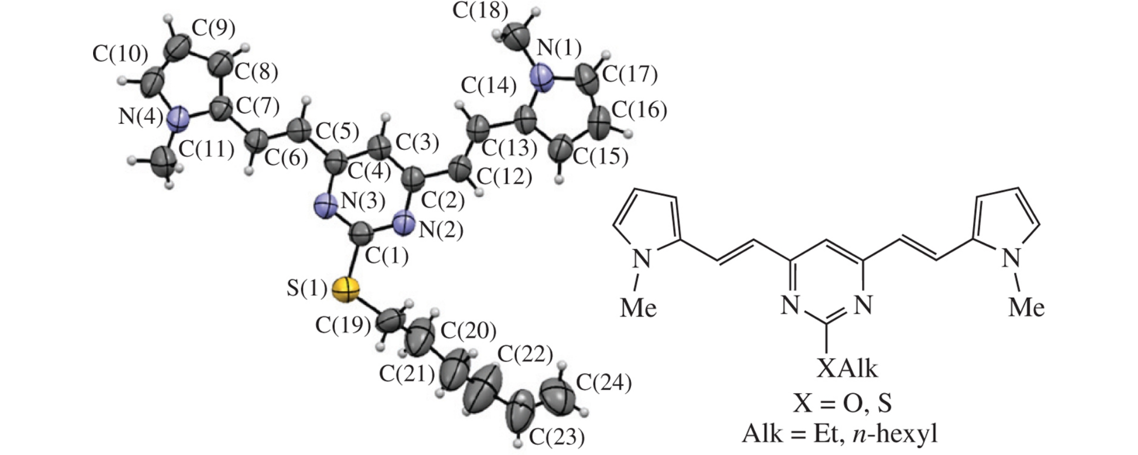A series of novel Y-shaped dyes bearing the D–π–A–π–D fragment comprising central 2-alkoxy-or 2-alkylthio-substituted pyrimidine core and terminal 2-(1-methyl-1H-pyrrol-2-yl)vinyl moieties have been synthesized and studied as potential materials for the organic electronics. The obtained compounds demonstrated an efficient absorption at ∼410nm with the high molar absorption coefficient (29790–40620 dm3 mol−1 cm−1) and fluorescence emission at ∼480nm (ΦF ∼ 7.5–8.6%). Thin films of 2-ethyloxy- or 2-ethylthiopyrimidines exhibited the red-shifted photoluminescence (∼600nm).