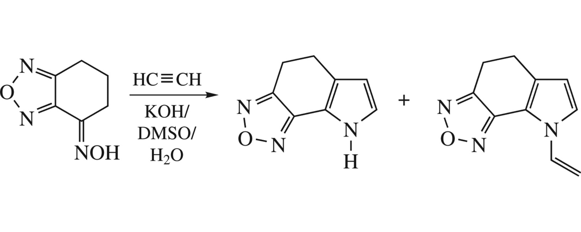 6,7-Dihydrobenzo[c][1,2,5]oxadiazol-4(5H)-one oxime is annelated with acetylene in the KOH/DMSO/H2O system under pressure to give NH- or N-vinyl-5,8-dihydro-4H-[1,2,5]oxadiazolo[3,4-g]indoles in 29 and 68% yields, respectively. These derivatives are readily aromatized with DDQ at room temperature to the expected indoles.