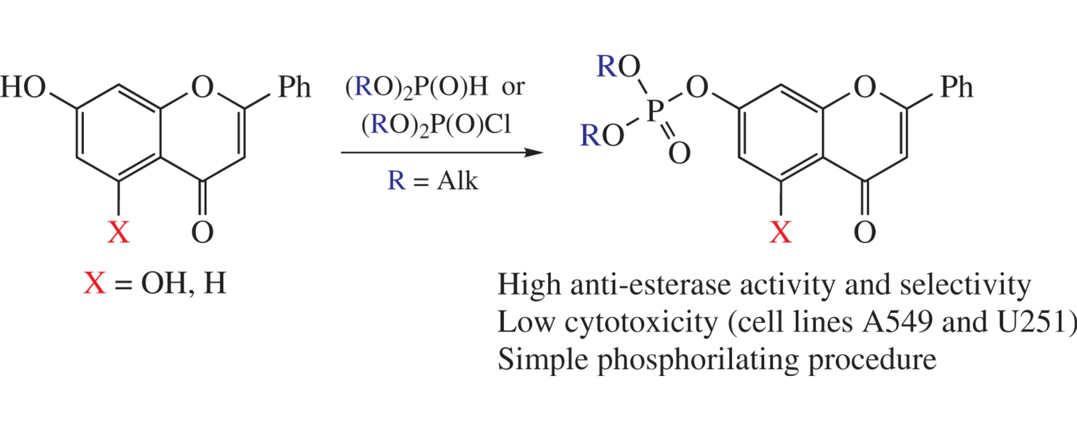 A series of phosphorylated flavonoids has been synthesized and evaluated in vitro for inhibitory activity against carboxylesterase, acetylcholinesterase and butyrylcholinesterase as well as for their cytotoxicity towards human adenocarcinoma A549 and human glioblastoma U251 cell lines. Diethylphosphoryl derivatives of chrysin and 7-hydroxyflavone were found to be the most effective with bimolecular rate constants for carboxylesterase inhibition ki=2.0×106 and 5.7×106dm3mol−1min−1, respectively.