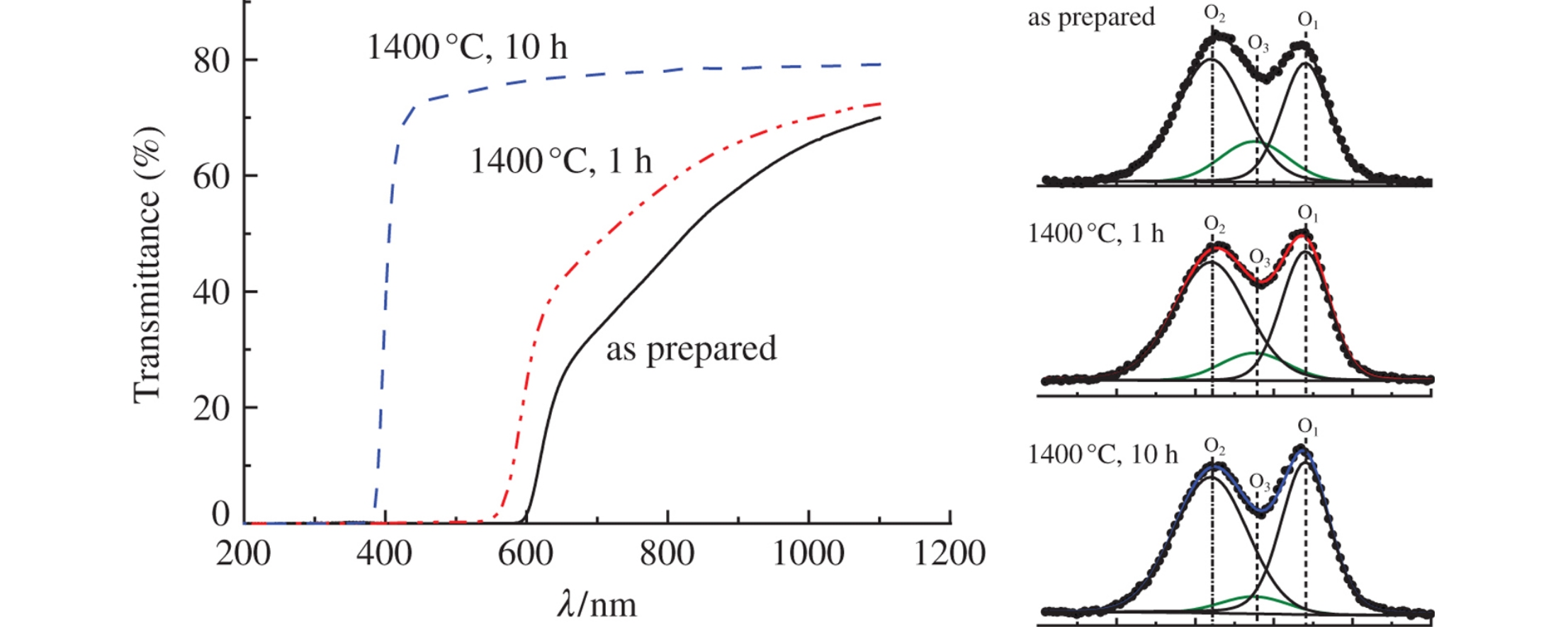 Yttrium oxide ceramics doped with CeO2 (5 mol%) were prepared from nanopowders produced by the laser ablation method. The optical measurements have demonstrated that the transparency of as-sintered ceramic was markedly increased after annealing (T=1400°C) under air. XPS data revealed the presence of mixed Ce3+ and Ce4+ states, while oxygen defect peak decreased after annealing owing to the defect elimination during oxygen diffusion into the highly defective ceramic.