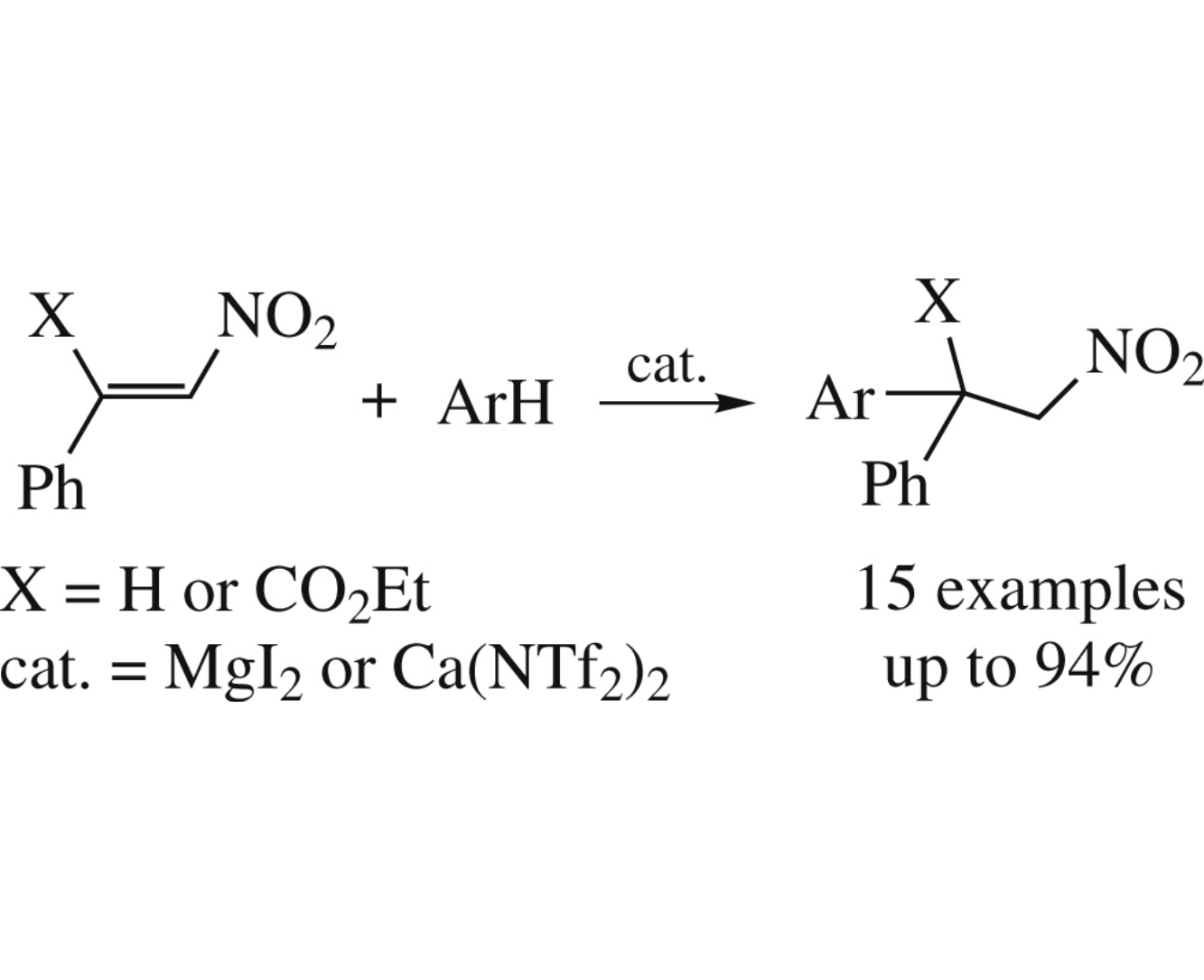The Friedel–Crafts reaction between electron-rich (het)arenes and β-nitrostyrenes under MgI2 or Ca(NTf2)2 catalysis affords 1-(het)aryl-2-nitro-1-phenylethanes in yields up to 94%.