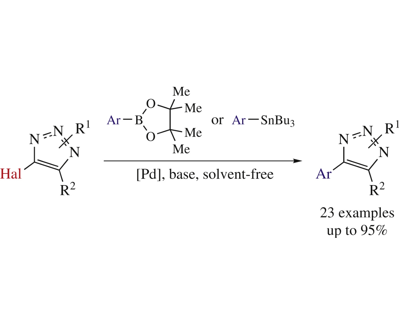 An environmentally friendly and efficient synthesis of fully substituted 1,2,3-triazoles comprises solvent-free palladium-catalyzed Suzuki cross-coupling of halo-1,2,3-triazoles with pinacol arylboronates. The efficiencies of Stille and Suzuki reactions with halotriazoles under solvent-free conditions were compared.