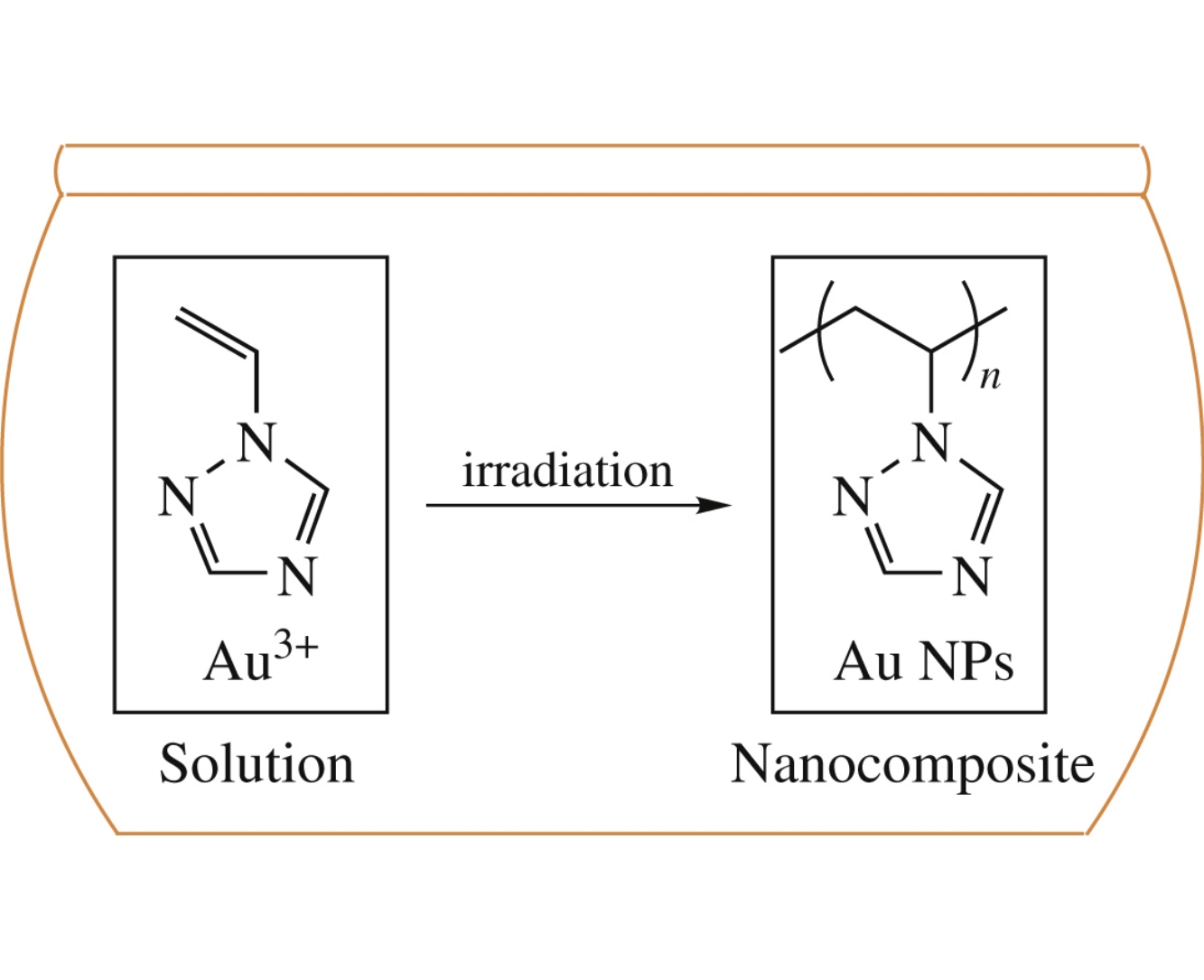 The X-ray irradiation of aqueous solutions containing 1-vinyl-1,2,4-triazole (monomer) and gold ions results in simultaneous polymerization and formation of nanoparticles, which provides a single-step preparation of metal-polymeric nanohybrids.