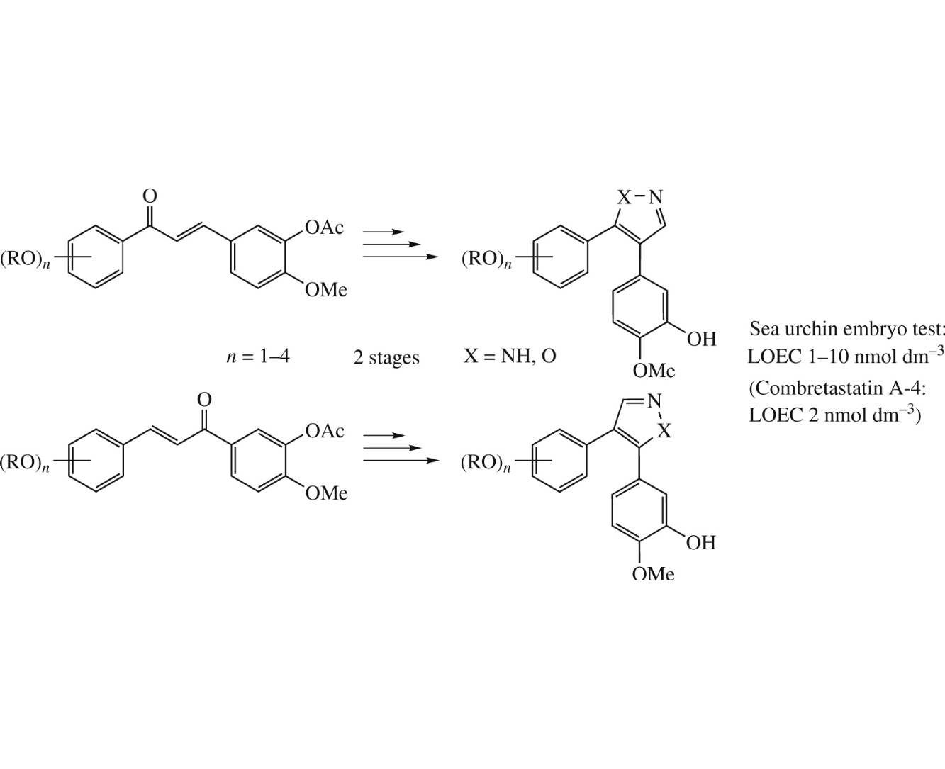 A series of combretastatin analogues, diarylpyrazoles and diarylisoxazoles, have been synthesized and evaluated for their antimitotic tubulin-binding activity using the phenotypic sea urchin (Paracentrotus lividus) embryo assay. One pyrazole analogue and four isoxazole analogues have been identified as potent antimitotic agents comparable with combretastatins A-2 and A-4, with the lowest observable effective concentration of 1–10nmoldm−3 for cleavage alteration of the test embryos.