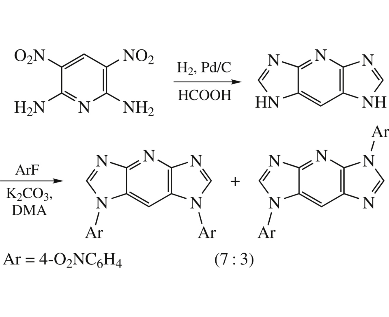 1,7-Dihydrodiimidazo[4,5-b:4′,5′-e]pyridine obtained by reductive heterocyclization was N-arylated with 4-fluoronitrobenzene to form two regioisomers in 7 : 3 ratio. This N-arylation is considered as a model reaction for the polymer synthesis.