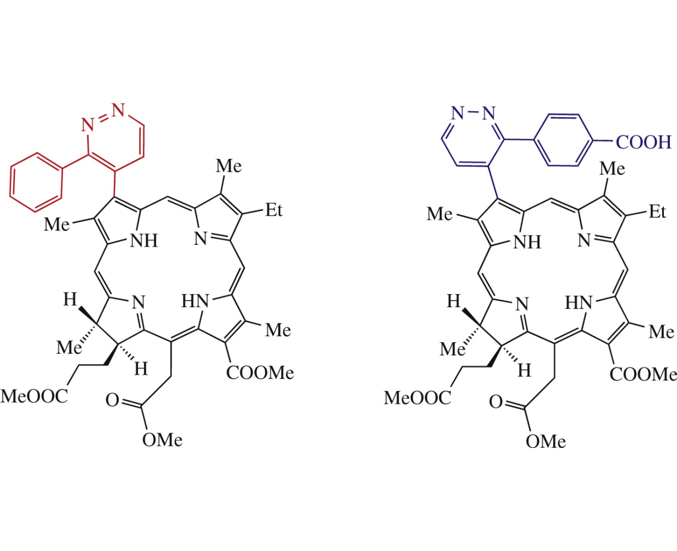 The addition of 3-aryl-1,2,4,5-tetrazines at the vinyl group of chlorin e6 trimethyl ester affords the corresponding pyridazine–porphyrin conjugates. The study of spectral properties of the obtained compounds revealed insignificant changes in the absorbance and fluorescence spectra as compared to those of chlorin.