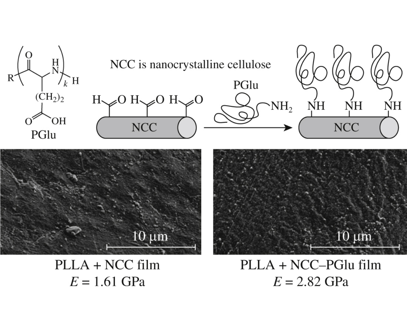 Several methods for chemical modification of nanocrystalline cellulose by poly(glutamic acid) were tested. The best one was based on partial oxidation of cellulose followed by reaction of the resulting aldehyde groups with terminal amino groups of poly(glutamic acid). The modified cellulose filler had an improved compatibility with hydrophobic poly(l-lactic acid) matrix for the preparation of composite materials.