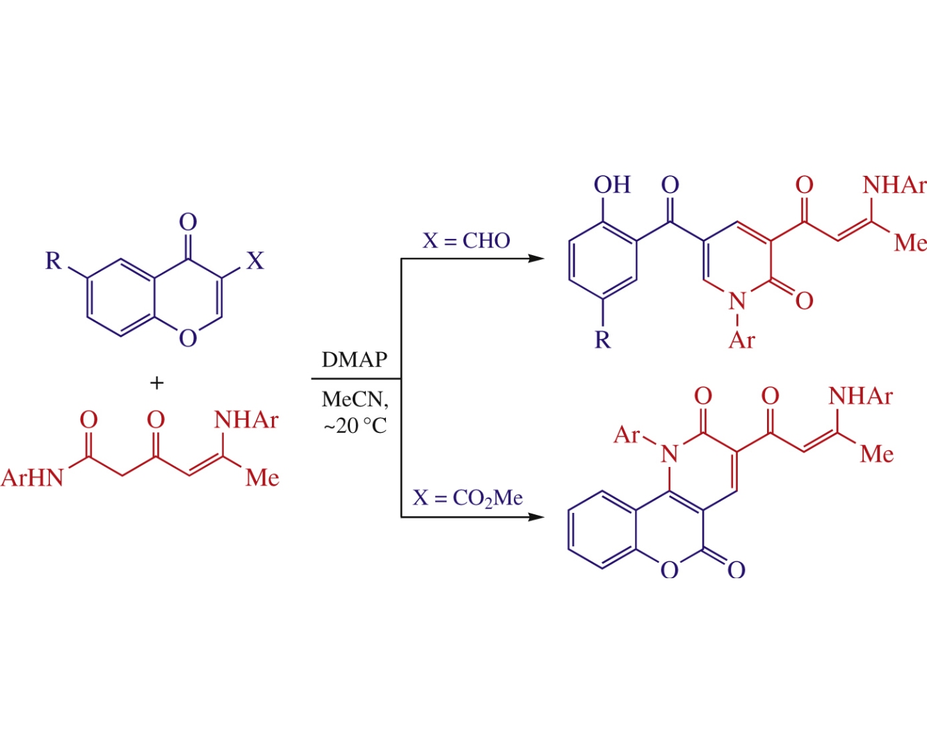 N-Aryl-5-arylamino-3-oxohex-4-enamides as 1,3-C,N-di-nucleophiles react regioselectively with 3-formyl or 3-methoxycarbonyl chromones in the presence of DMAP in MeCN to form 2-pyridones (34–43%) or chromeno[4,3-b]pyridine-2,5-diones (54–73%) bearing the amino enone moiety.