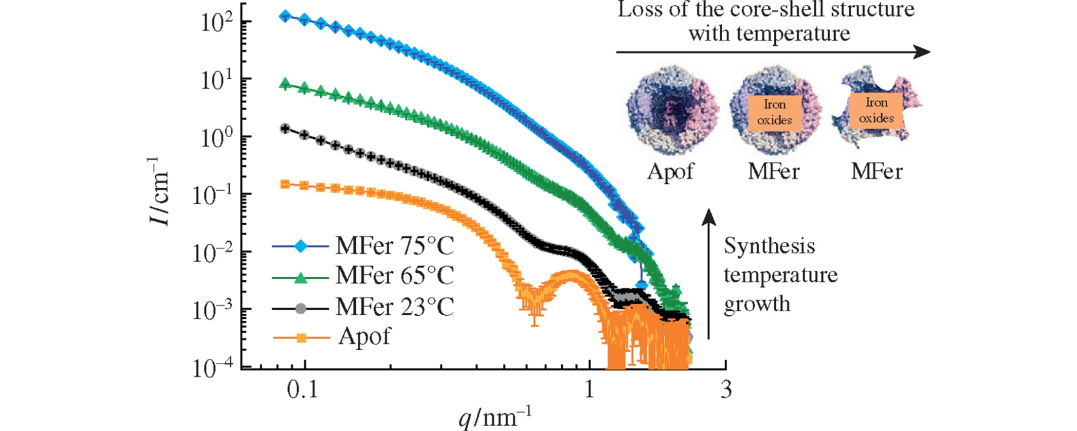 The variation of synthesis temperature made it possible to produce artificial ferritins possessing different structural and magnetic properties, size distribution, and colloidal stability. The effect of synthesis temperature on the core structure and stability of protein shell was investigated using small-angle neutron scattering, small-angle X-ray scattering, SQUID magnetometry, dynamic light scattering, and zeta potential measurements. The optimal temperature was established for the synthesis of artificial ferritin suitable for biomedical imaging applications at ∼60°C, which is close to the protein denaturation temperature.