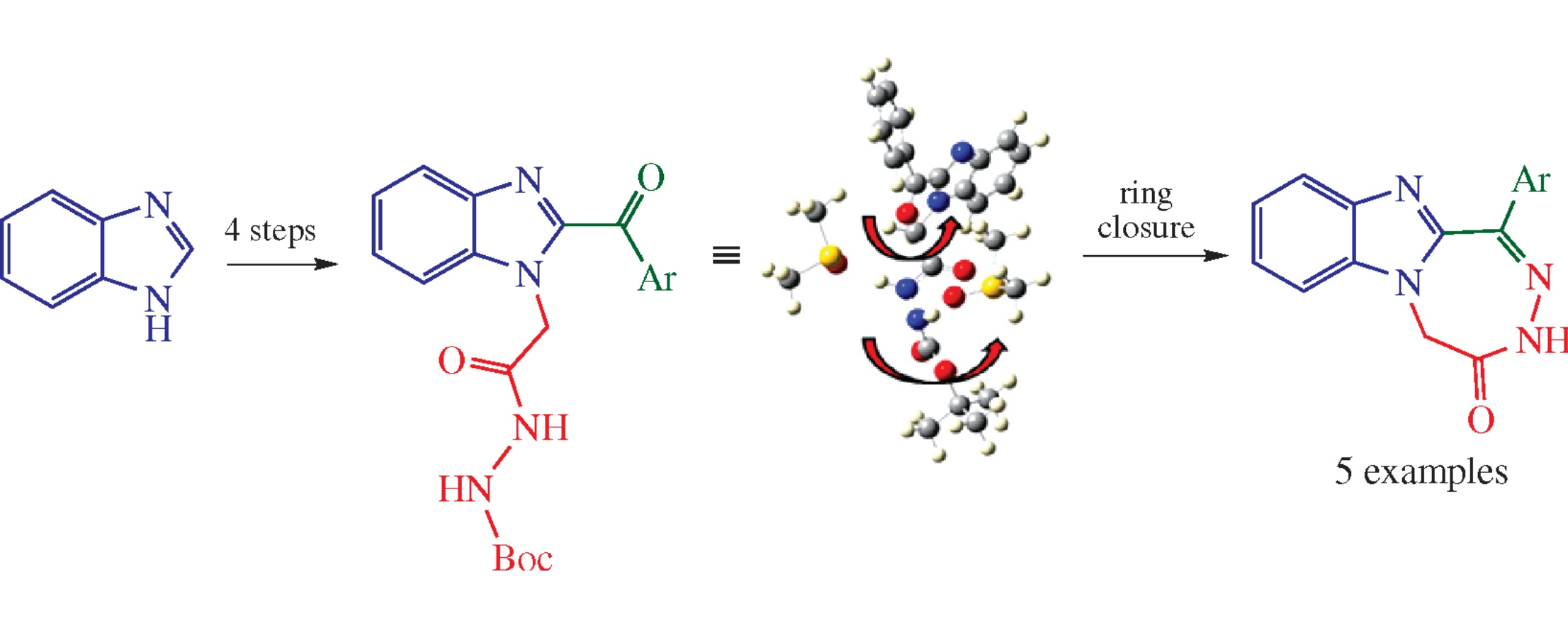 3H-[1,2,5]Triazepino[5,4-a]benzimidazol-4(5H)-ones were obtained in five steps involving C-acylation of benzimidazole, its N-alkylation with ethyl bromoacetate, the ester hydrolysis, condensation with BocNHNH2, and the acid-catalyzed heterocyclization of thus obtained 2-(2-aroyl-1H-benzimidazol-1-yl)-N′-(tert-butoxycarbonyl)acetohydrazides. The geometry of tert-butyl carbazate rotamers was estimated with quantum chemical calculations.