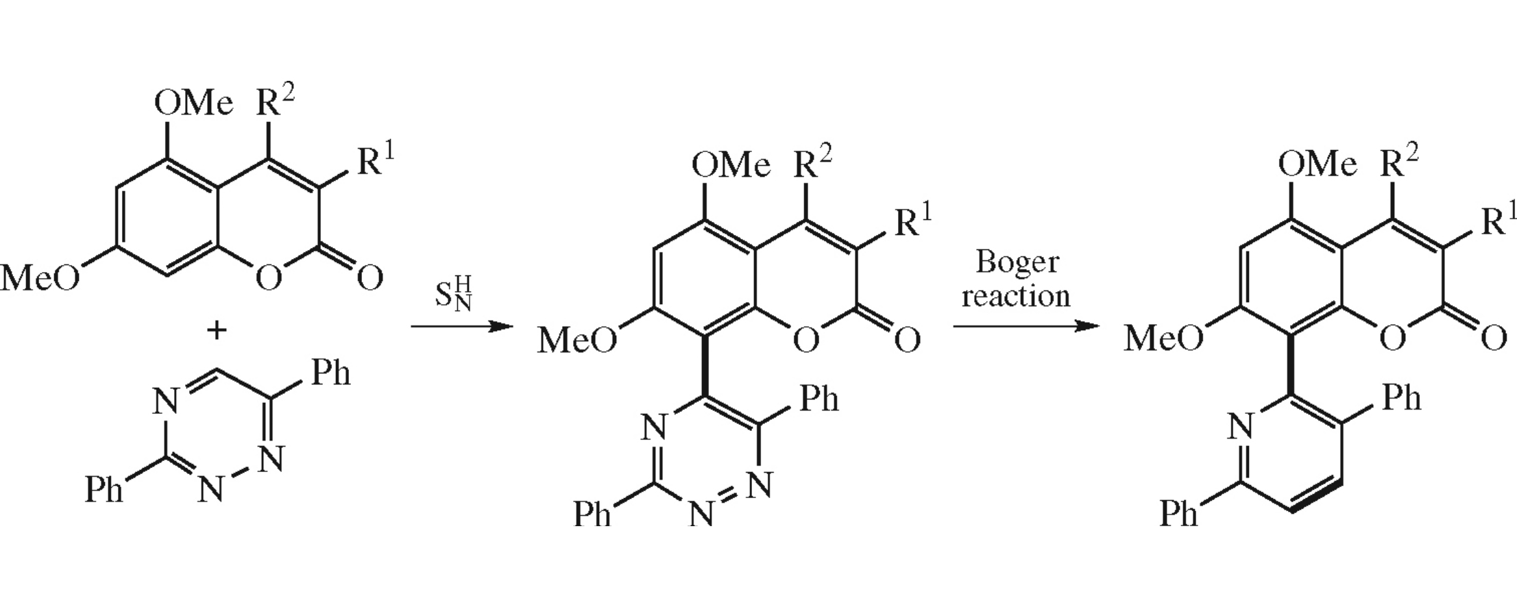 5,7-Dimethoxy-8-(3,6-diphenylpyridin-2-yl)coumarins were obtained from 5,7-dimethoxycoumarins and 3,6-diphenyl-1,2,4-triazines via the protocol comprising aromatic \( \mathrm{S_N^H} \) substitution in the triazine ring followed by the Boger transformation of formed triazine moiety into the pyridine one. The advantages of the suggested method are simple procedures, high yields, and the absence of transition-metal catalysts.