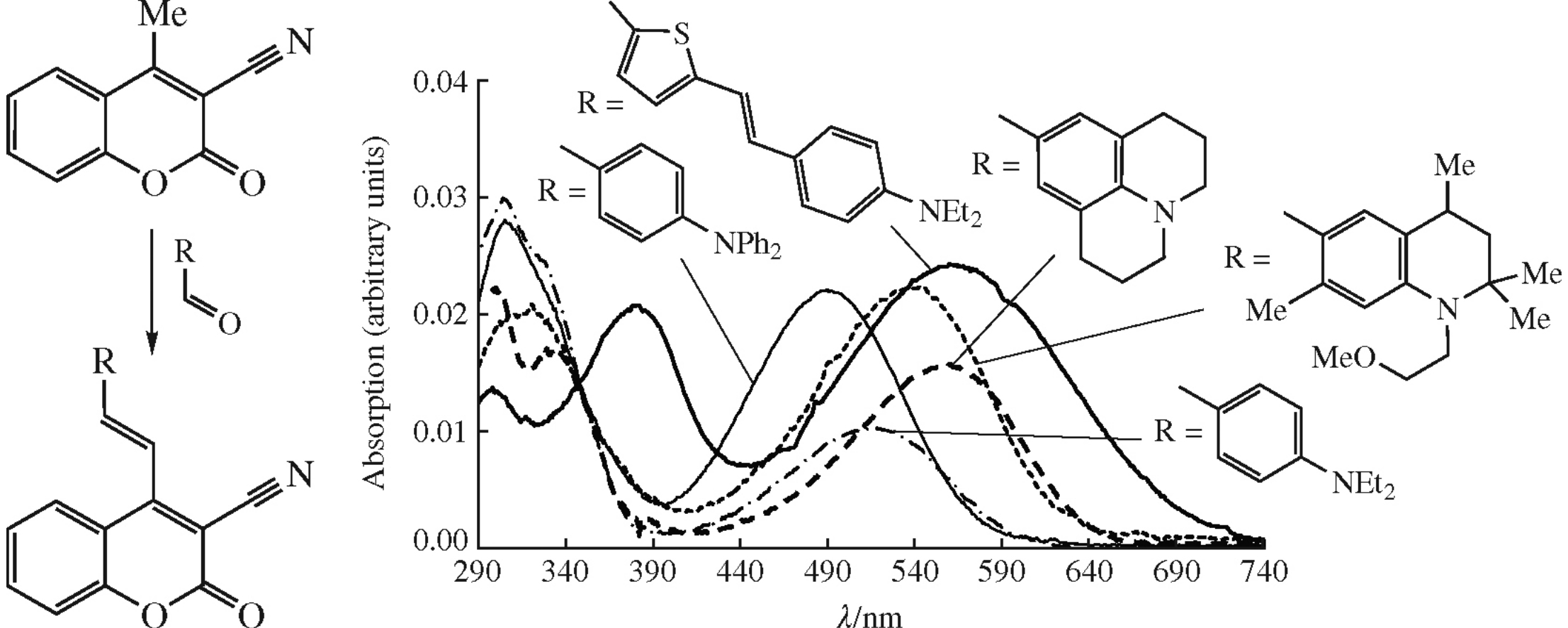 New derivatives of 2-oxo-4-vinyl-2H-chromene-3-carbonitrile have been synthesized by the Knoevenagel reaction of 4-methyl-2-oxo-2H-chromene-3-carbonitrile with aromatic and heteroaromatic aldehydes. The first hyperpolarizability β for the obtained compounds was calculated using M05-2X functional and 6-31+G(d) basis set; their optical properties and solvatochromism in solvents of various polarity were examined. The crystal structure for one representative of the synthesized compounds was determined by XRD.