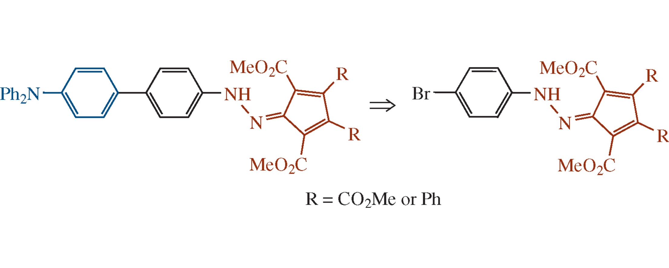 First representatives of a novel class of compounds containing an electron-accepting hydrazonocyclopentadiene moiety, π-conjugated phenylene spacer, and electron-donating triphenylamine moiety have been synthesized. Investigation of their optical, electrochemical and photovoltaic properties revealed a high potential of the hydrazonocyclopentadiene acceptor moiety in the design of donor-acceptor compounds for organic photovoltaics.