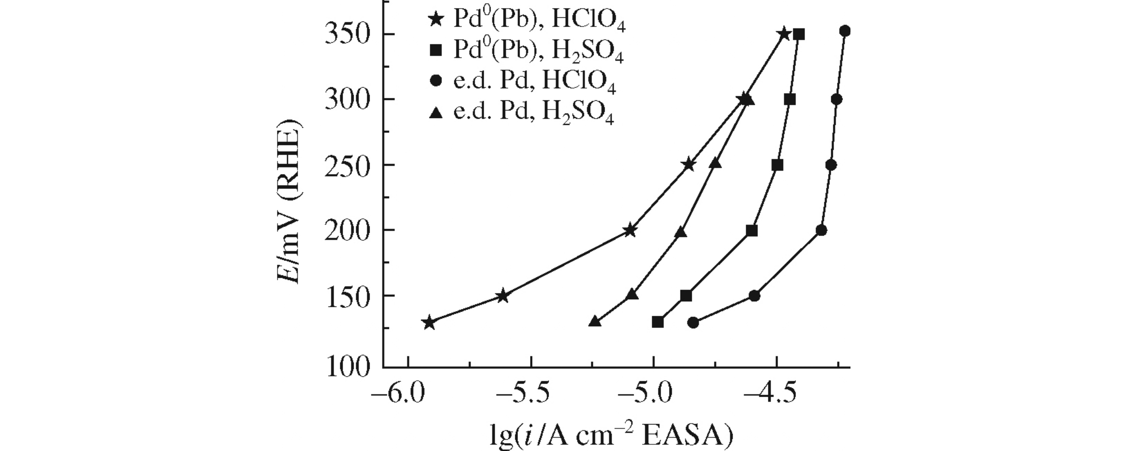 Galvanic displacement of electrodeposited lead by palladium fails to produce Pd shells. The anomalous ratio between formic acid electrooxidation reaction (FAOR) rates on Pd0(Pb) observed in HClO4 and H2SO4 solutions is associated with the reduction of ClO4− anions to chloride ones which inhibit the FAOR.