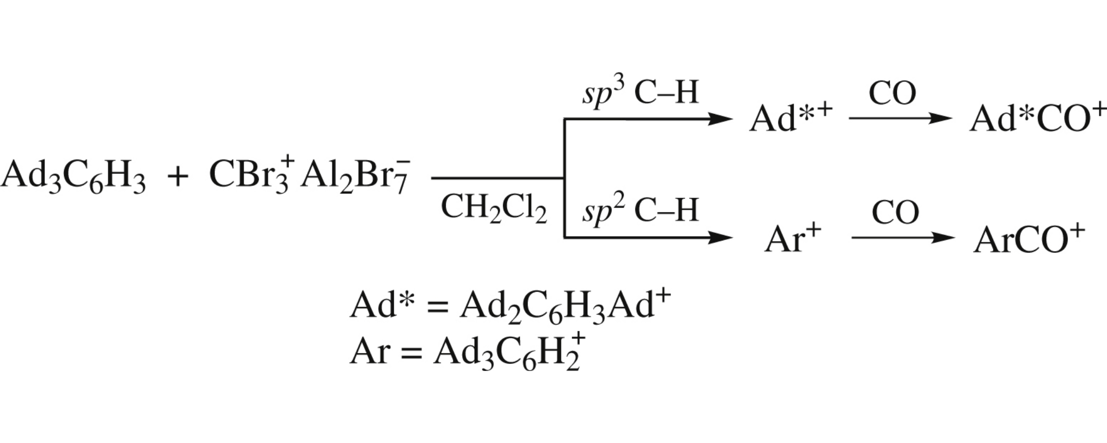 The DFT B3LYP-/6-311+G* calculations of the reactions beween 1,3,5-Ad3C6H3 (Ad=1-adamantyl) and CBr3+Al2Br7− with or without CO reveal that only sp3 C–H route occurs.