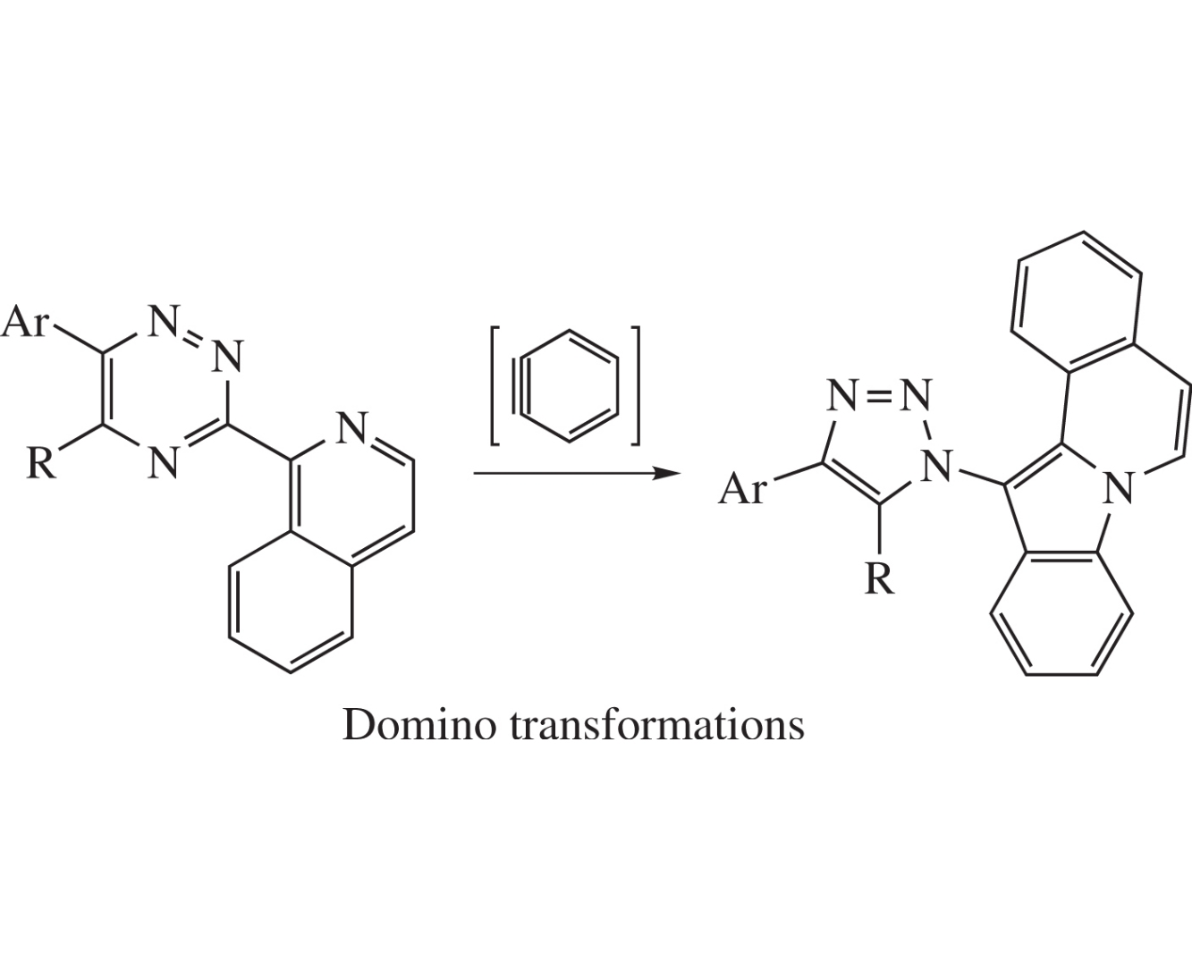 12-(1H-1,2,3-Triazol-1-yl)indolo[2,1-a]isoquinolines are prepared in 51–56% yields using a PASE (pot, atom, step, economic)-based approach, namely, by the reaction between available 5-R-6-Ar-3-(isoquinolin-1-yl)-1,2,4-triazines and in situ generated benzyne. A mechanism comprising domino-transformation was suggested, and the structure of one key product was confirmed by a single crystal X-ray diffraction analysis.