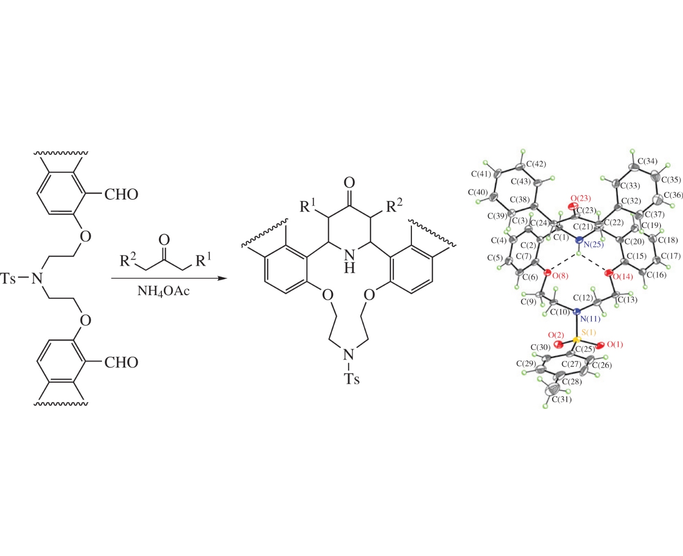 For the development of new antitumor agents, novel dibenzo-1,7-diaza-14-crown-4 ethers containing γ-piperidone moiety were synthesized by a domino condensation of new podands, ketones and ammonium acetate. The crystal structure of one Ts of them was studied by X-ray diffraction. Four crown compounds were evaluated in vitro for cytotoxic activity against 5 human cancer cell lines.