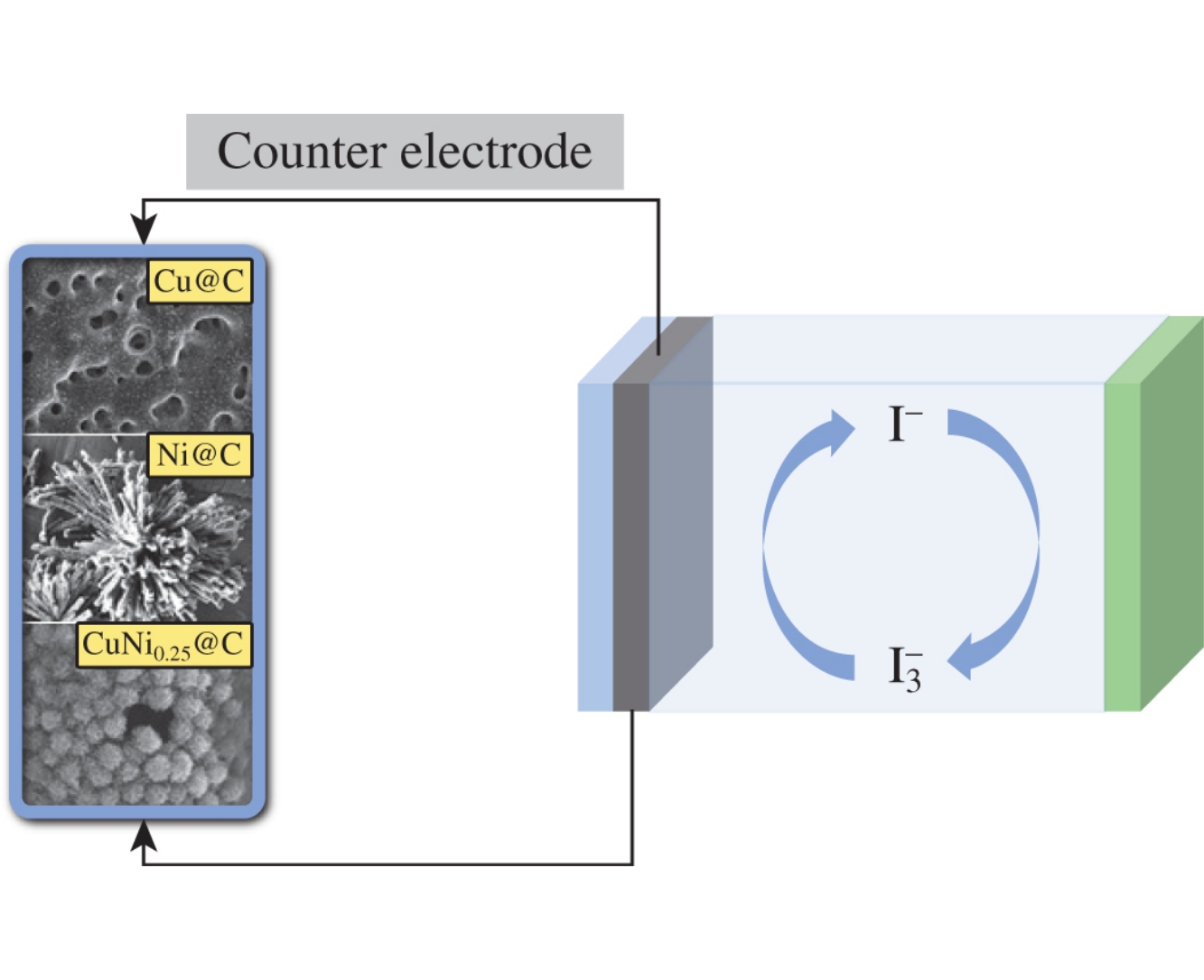 A Cu–Ni-containing bimetallic carbon-based material was prepared by the pyrolysis of a metal-organic framework (MOF) synthesized from copper and nickel salts and trimesic acid precursors at room temperature. This material was tested as a counter electrode for the reduction of I3− by means of cyclic voltammetry.