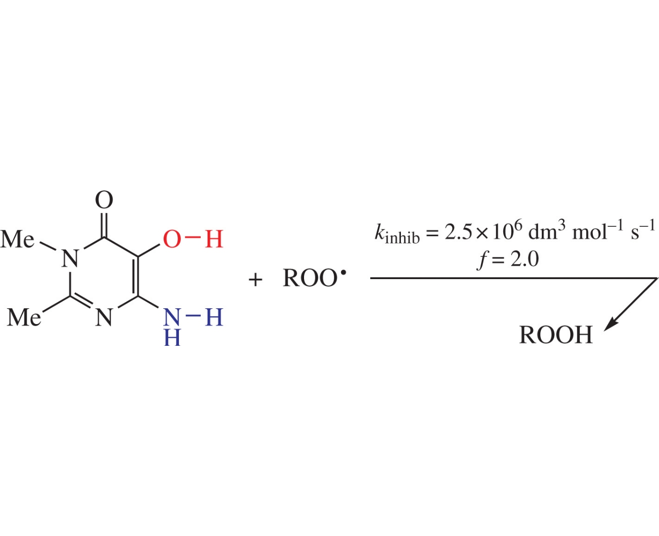 6-Amino-5-hydroxy-2,3-dimethylpyrimidin-4(3H)-one inhibits initiated styrene oxidation with the same efficiency as vitamin E compounds. Calculations at M05/MG3S level of theory for the abstraction of a hydrogen atom by a peroxyl radical indicate an early transition state, which closely resembles a pre-reaction hydrogen bond-containing complex responsible for the high rate constant.
