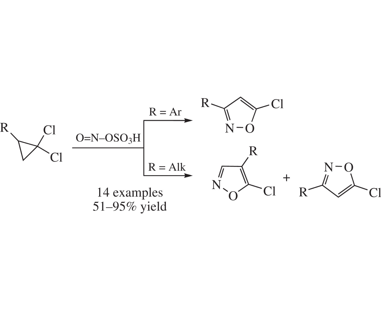 Nitrosylsulfuric acid is shown to be a usable reagent for the synthesis of 5-chloroisoxazoles from readily available 1,1-di-chlorocyclopropanes via nitrosation–heterocyclization reaction. A cytotoxicity of some of the prepared 5-chloroisoxazoles towards MCF7, A549, HEK293T and VA13 cell lines was evaluated.