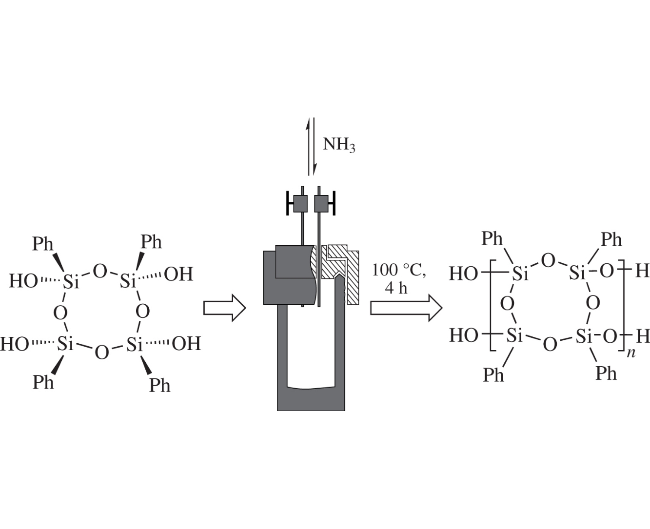 One-step method for the preparation of polyphenylsilsesqui oxane by condensation of all-cis-1,3,5,7-tetraphenyl-1,3,5,7 tetrahydroxycyclotetrasiloxane in liquid ammonia has been developed. This method makes it possible to produce high molecular weight polymers with regular structure in the absence of organic solvent. The structure of the polymer product was confirmed by 1H and 29Si NMR spectroscopy, GPC, IR spectroscopy, powder X-ray diffraction and viscosimetry.